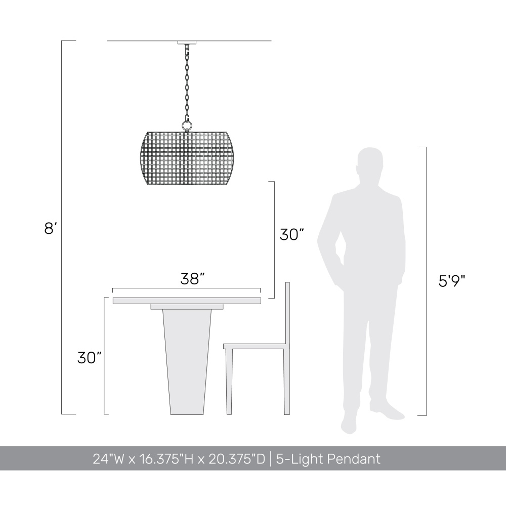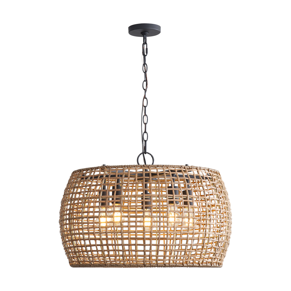 Illuminate your home with the relaxed elegance of the Wry Lighting Weavelight 5-light Pendant. Featuring a handcrafted wicker design and a Natural Black finish, this fixture brings a distinct touch to your environment. With its Maple All-Weather Wicker construction, this pendant showcases a warm, honey-brown shade woven from durable synthetic fibers that enhance any room with its playful light and natural charm. Boasting a Natural Black finish, it complements various decor styles, from modern farmhouse to eclectic settings. Rated for dry locations, this fixture is perfect for indoor dining areas, kitchens, and open layouts. Adjust the height easily to suit your space, ranging from 19.75" to 93.25". Overall dimensions measure 24"W x 16.38"H x 24"D, and it requires 5 E26 Medium base bulbs (not included) with a maximum wattage of 100 per bulb. Experience warmth and style in your living space with this delightful pendant light.
