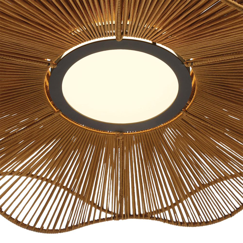 Bring nature-inspired elegance into your home with the Wry Lighting Whisper Integrated LED Pendant in Latte Rope. Featuring a rope shade and a bronze frame, it creates a welcoming atmosphere. The latte rope shade is an artisanal masterpiece, hand-wrapped around a flowing frame that plays beautifully with light and shadow. Its intricate texture adds a touch of warmth and sophistication. This sculptural design is perfect for kitchens, dining rooms, and bedrooms, providing focused yet decorative illumination in entryways, foyers, and bathrooms. Dry Location Rated: Ideal for indoor spaces not subject to moisture. Sloped-Ceiling Compatible and Adjustable Height: Easily install on angled ceilings and customize the hanging length from 30" to 123". Overall Dimensions: 23.63"W x 8.5"H x 23.63"D. Integrated LED Technology offers 900 rated lumens at a warm 3000K glow. Close your environment with a stunning focal point that reflects quality craftsmanship and natural beauty.