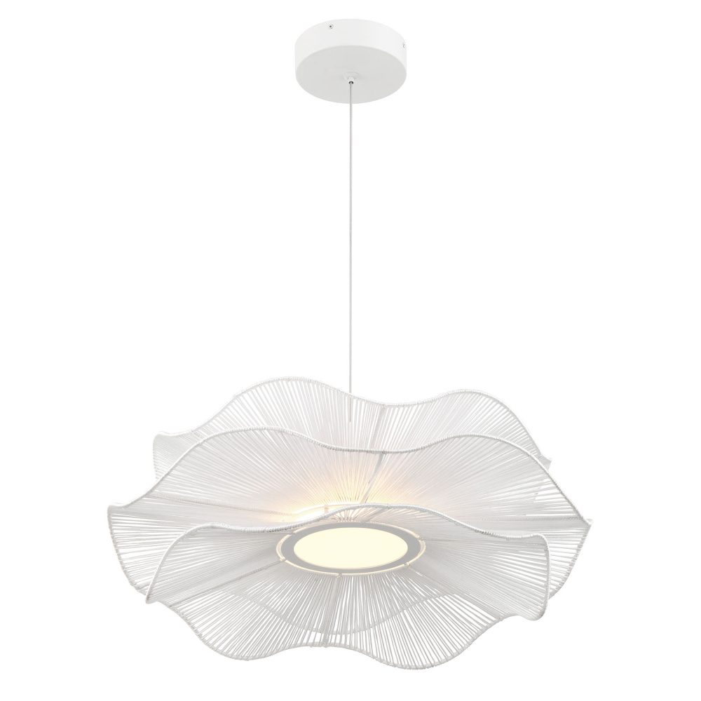 Bring nature-inspired elegance into your home with the Wry Lighting Whisper Integrated LED Pendant in Matte White. Featuring a rope shade and a white frame, it creates a welcoming atmosphere. The matte white shade is smooth and non-reflective, enhancing the light's absorption for an understated look. This minimalist design is perfect for kitchens, dining rooms, and bedrooms, providing focused yet decorative illumination in entryways, foyers, and bathrooms. Dry Location Rated: Ideal for indoor spaces not subject to moisture. Sloped-Ceiling Compatible and Adjustable Height: Easily install on angled ceilings and customize the hanging length from 30" to 123". Overall Dimensions: 23.63"W x 8.5"H x 23.63"D. Integrated LED Technology offers 900 rated lumens at a warm 3000K glow. Experience the blend of style and functionality with a fixture that reflects quality and modernity.