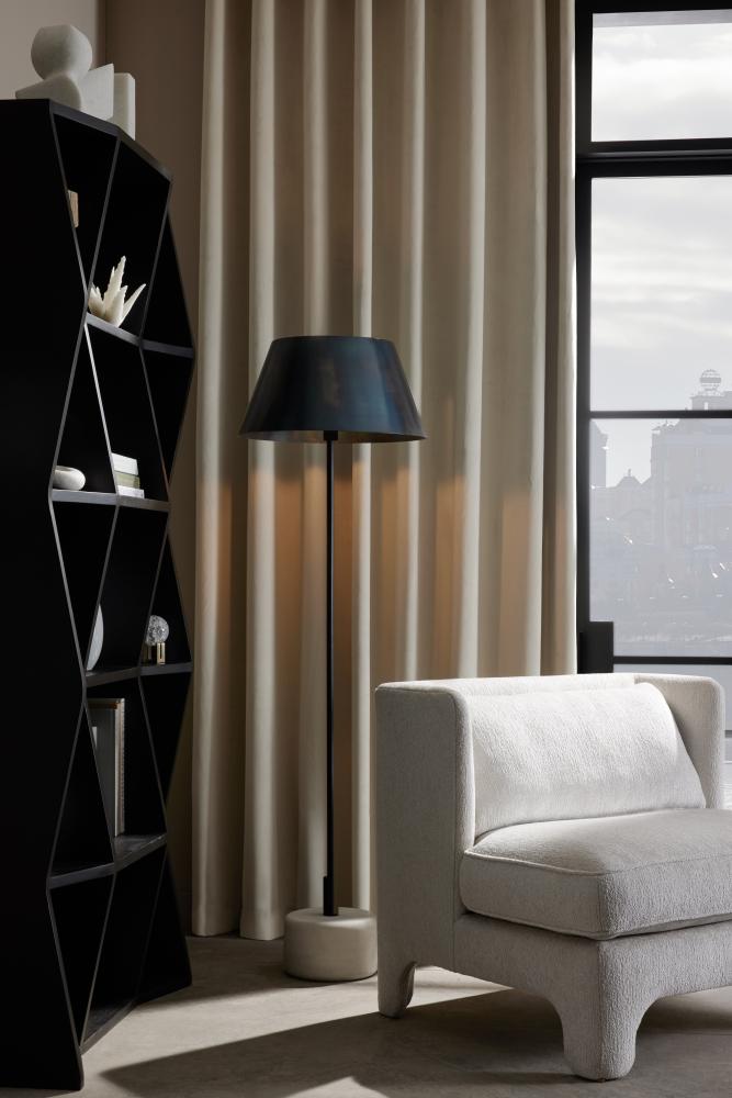 The natural textures of burnt iron and sandblasted marble make Xena eye-catching in any setting. Crafted with a slender rod and matching iodized iron shade, its clean geometric shape is anchored by a rounded marble base. Clear silver cord and three-way rotary switch.