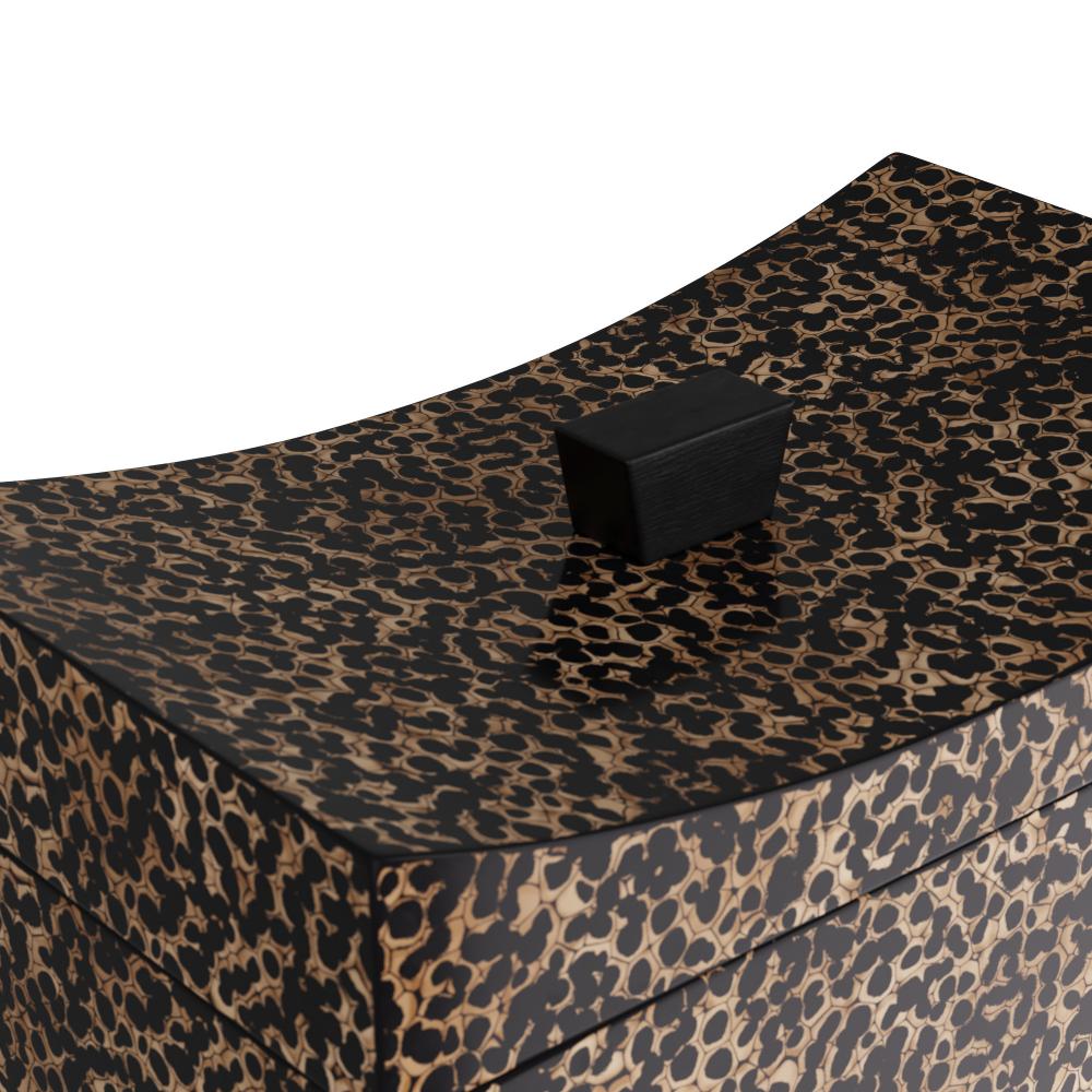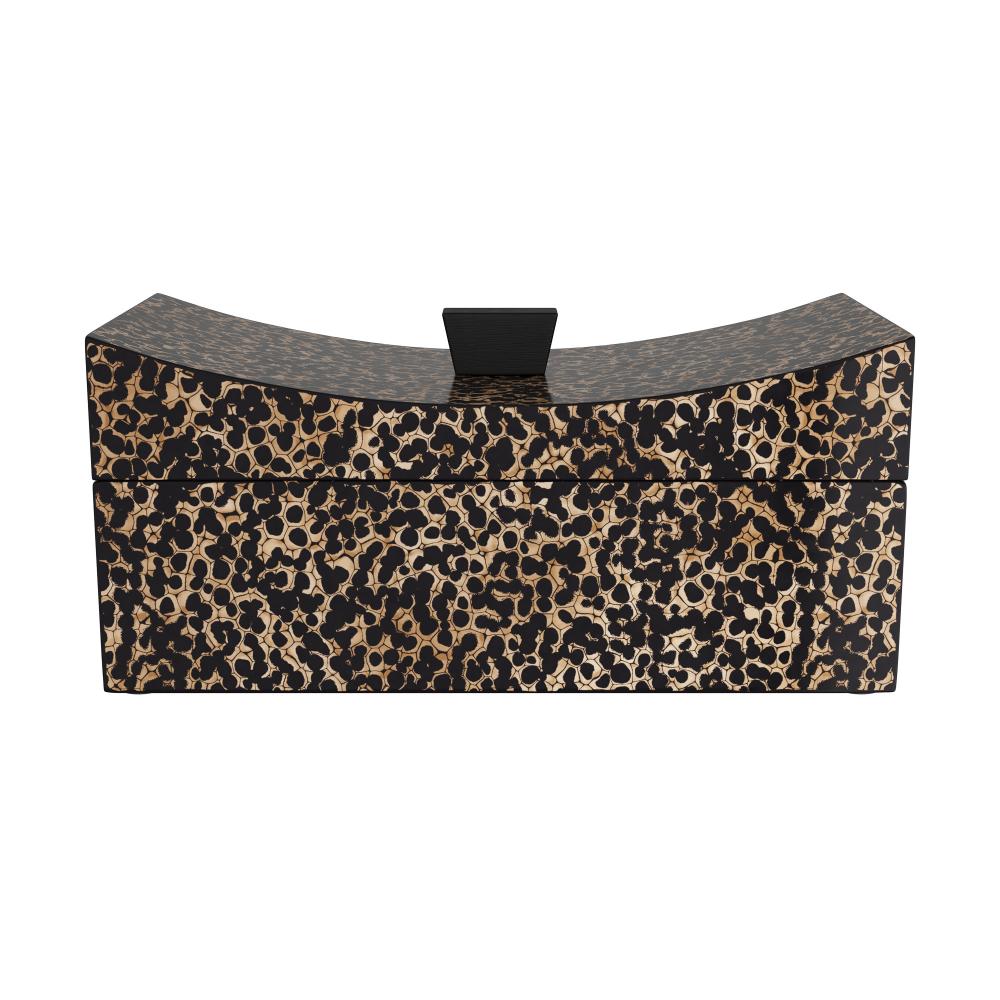Adorned in black and ivory eggshell lacquer with a black lacquered handle, the speckled effect of this elegant box intrigues the eye. Inspired an ancient Chinese empire pillow, the curved lid opens to reveal a black wood interior. Finish will vary.