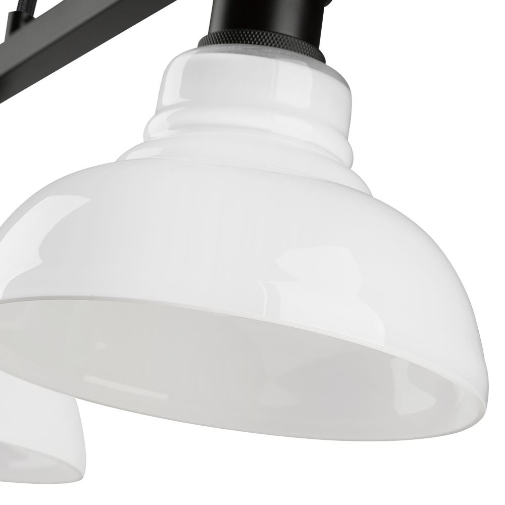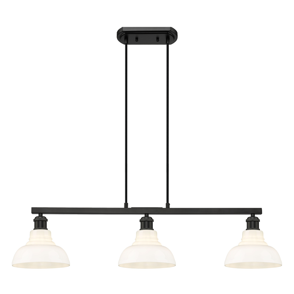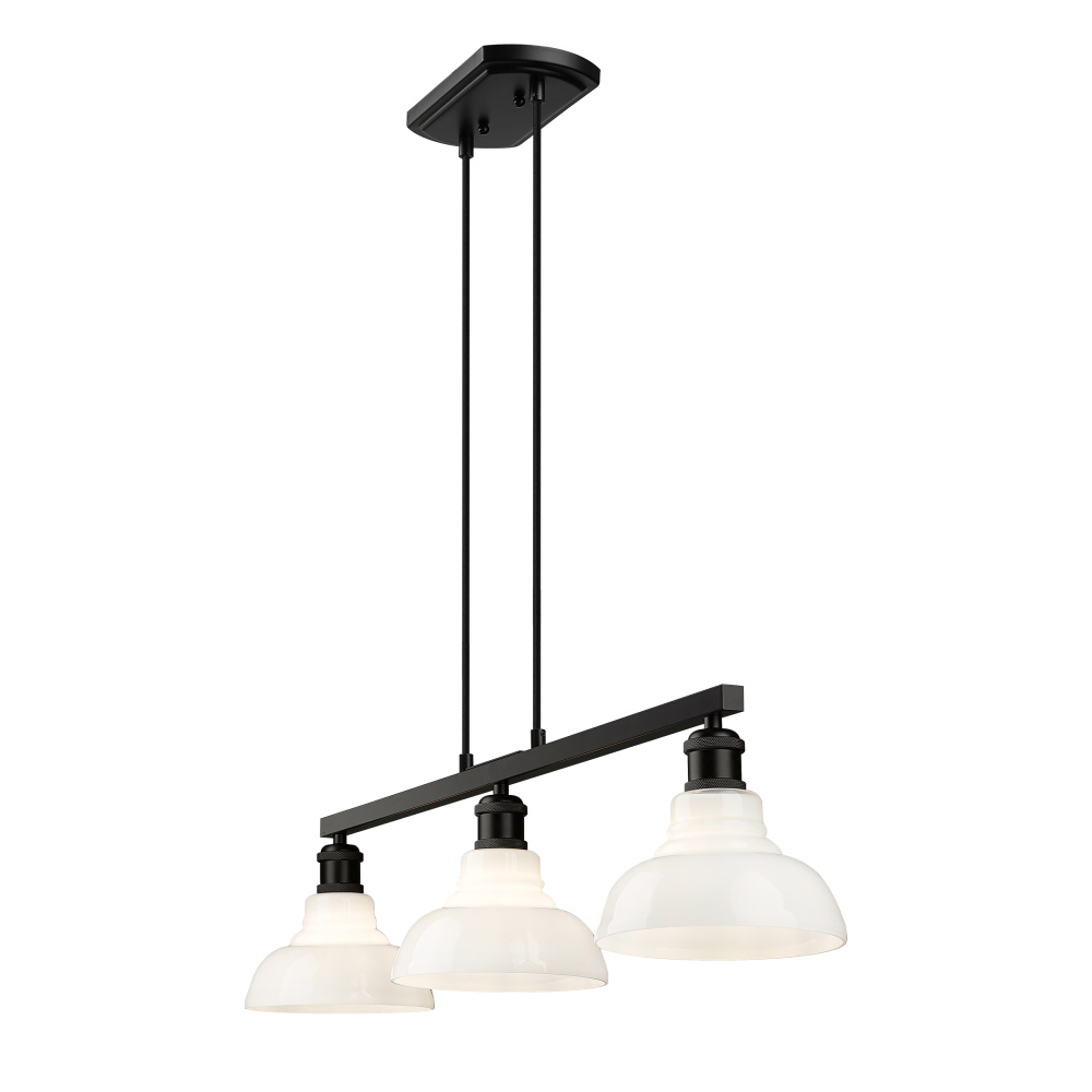 Bring nostalgic charm into your home with the Yep by Golden Lighting Carver 3-light Island Light. Featuring a vintage milk glass shade and a Matte Black frame, it creates a welcoming atmosphere. The Vintage Milk Glass shade offers a soft, luminous, and glare-free glow that brings warmth to any space. Its polished surface reflects authentic retro character, making it an exceptional choice for cozy settings. The Matte Black finish is timeless and versatile, providing a smooth texture that seamlessly integrates with various decors—from minimalist to bold. Tailored for kitchen islands, this fixture enhances both utility and style. It is Damp Location Rated, suitable for covered and semi-enclosed spaces with occasional moisture, and is Sloped-Ceiling Compatible with an Adjustable Height that allows customization. Overall Dimensions: 35.5"W x 9.5"H x 8.25"D. Requires 3 E26 Medium base bulbs (not included), max 60 watts per bulb. Close with lifestyle appeal and quality, perfect for creating a cozy haven in your home atmosphere.
