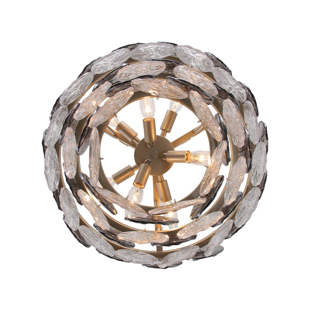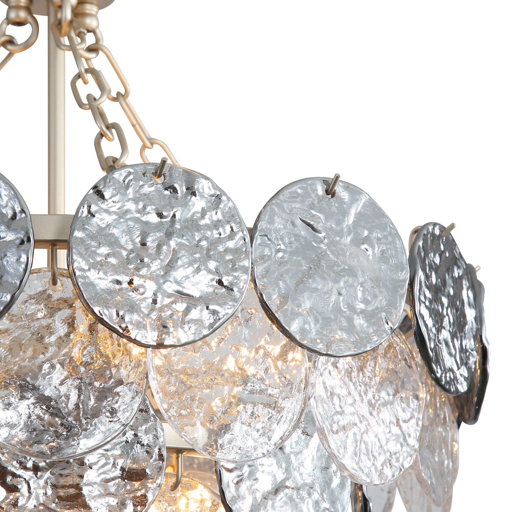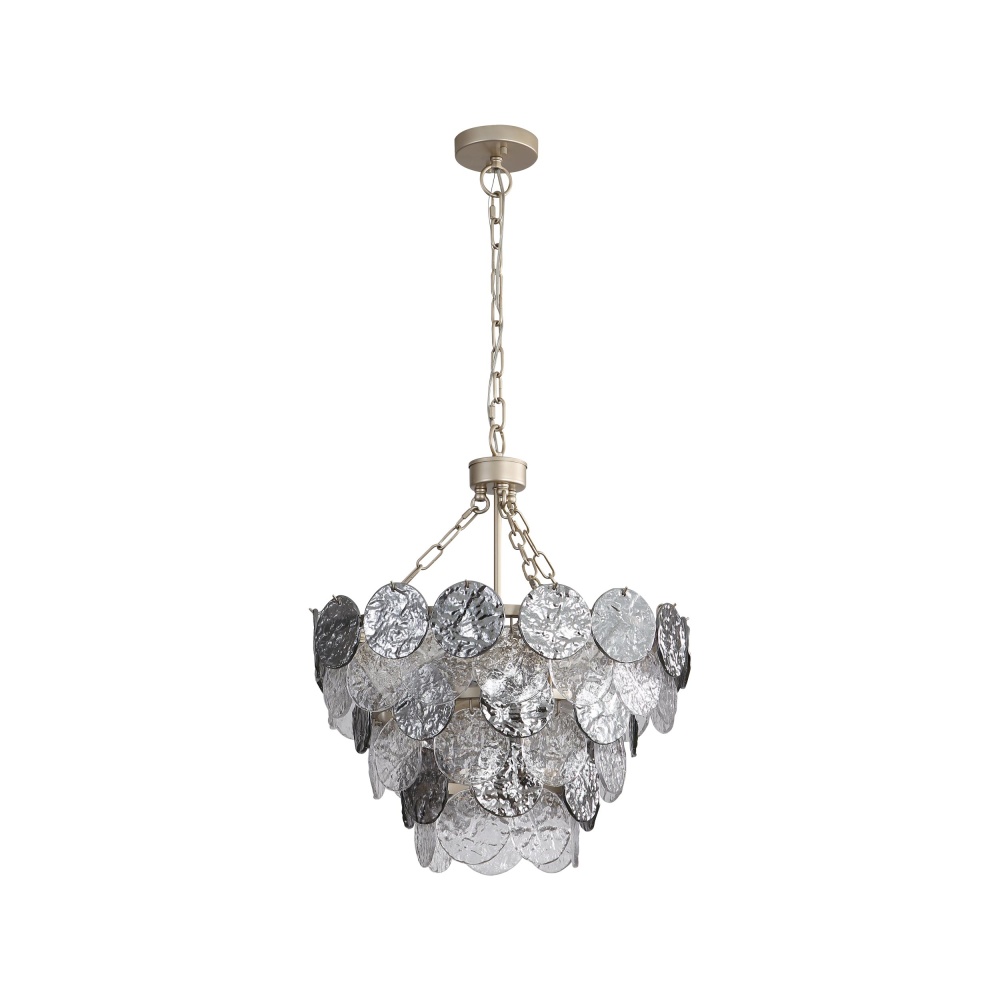 Bring coastal elegance into your home with the Yep by Golden Lighting Cascada 8-light Pendant in Aegean Silver and Smoke Plated Glass. Featuring a glass shade, this stunning piece creates a welcoming atmosphere. Each glass shade exhibits a captivating smoke-tinted finish, with a liquid-like mirrored sheen achieved through an advanced vacuum plating process. This bespoke design transforms from reflective when off to beautifully illuminating when lit. The Aegean Silver finish adds sophisticated texture with a soft satin lustre, seamlessly merging modernity with coastal charm. This refined silver tone complements a wide range of home styles. Ideal for kitchens, dining rooms, and hallways, this pendant is dry location rated for indoor use. The installation offers sloped-ceiling compatibility and is adjustable from 27.5" to 101.5" in height. Overall Dimensions: 20.13"W x 23.75"H x 20.13"D. Requires 8 E12 Candelabra base bulbs (not included), max 60 watts per bulb. Enhance your living space with this exquisite light fixture that highlights quality and elegance.