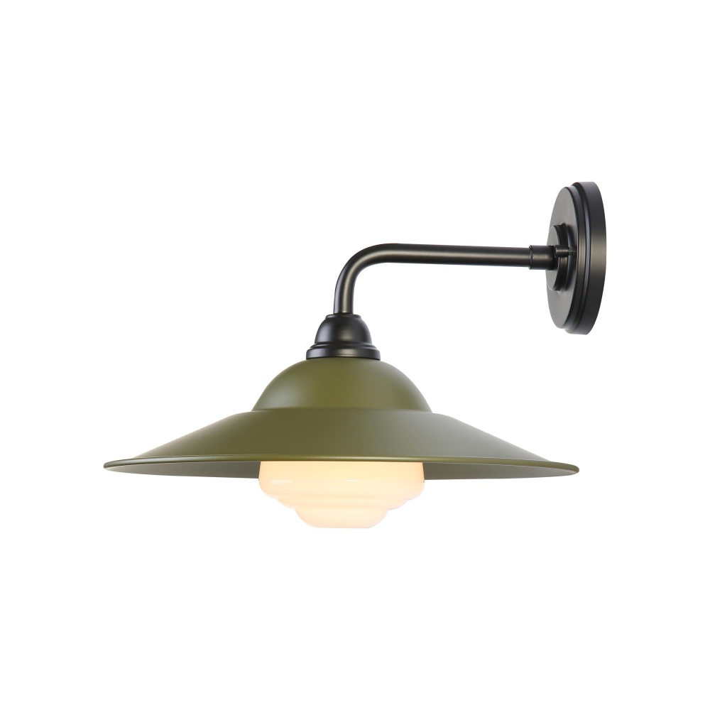 Bring farmhouse elegance into your home with the Yep by Golden Lighting Croma 1-light Wall Sconce. Featuring a metal shade and matte black frame, it creates a welcoming atmosphere. The metal shade presents a stunning Matte Pine finish, giving a lovely olive green touch, complemented by the white bell glass that provides a warm, diffused light effect. The matte black finish is versatile and blends well with various design styles, ensuring a timeless elegance. Wet Location Rated: Designed to endure exposure to elements, making it suitable for uncovered outdoor areas. Enhance hallways, stairways, and bathrooms — or add cozy ambiance in bedrooms and dining rooms. Requires 1 E26 Medium base bulb (not included), Max 60 watts. Overall dimensions are 15"W x 9"H x 15.5"D. Close with lifestyle appeal and quality for a beautifully illuminated outdoor space.