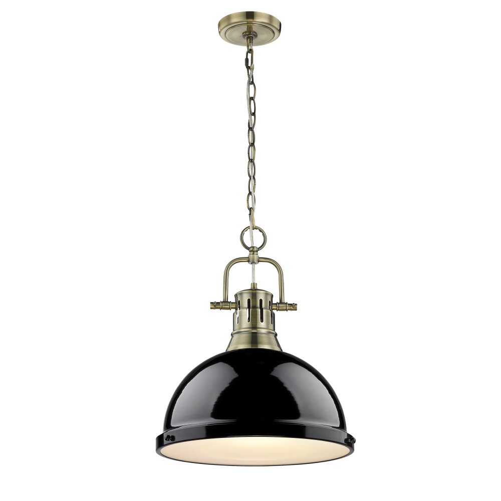 Enhance your home with the Yep by Golden Lighting Duncan 1-light 14in Chain Hung Pendant in Aged Brass and Black shade. This unique fixture features a metal shade and an aged brass finish, creating a striking visual impact. The metal shade, finished in a glossy black, reflects light magnificently, adding a dramatic touch to your living space while ensuring functional illumination. Our aged brass finish, reminiscent of vintage heirlooms, offers a warm glow, harmonizing beautifully with the bold contrast of the black shade, perfect for traditional and industrial-inspired designs. Ideal for stylish statements in kitchens, dining rooms, or bedrooms, this pendant is damp location rated, ensuring safety in covered areas. The sloped-ceiling compatibility and adjustable height, ranging from 19.875" to 91.875", allows for versatile installation options. Requires 1 E26 Medium base bulb (not included), with a maximum of 100 watts. Overall dimensions of 14"W x 16.88"H x 14"D ensure that this pendant is both a functional light source and a statement piece for your decor.