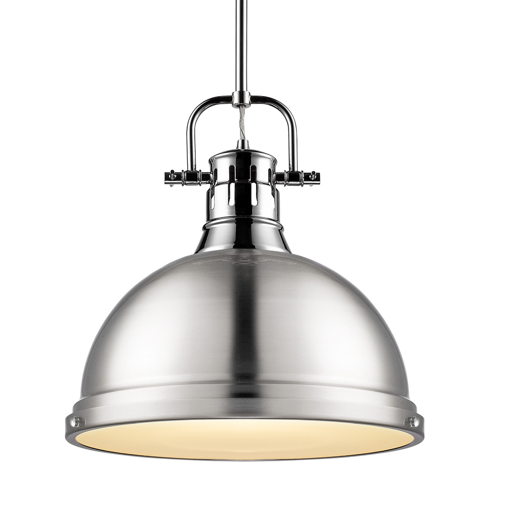 Bring farmhouse elegance into your home with the Yep by Golden Lighting Duncan 1-light 14in Rod Hung Pendant. Featuring a metal shade and a chrome frame, it creates a welcoming atmosphere. The pewter shade has a soft and classic appeal, featuring a warm silver-grey color with a satin lustre that gently diffuses light, providing an elegant glow. Our polished chrome finish offers a brilliant, mirror-like surface that's both sleek and sophisticated, easy to clean, and versatile, fitting seamlessly into various decor styles. Ideal for use in covered and semi-enclosed spaces, it’s damp location rated and can be easily installed on sloped ceilings with an adjustable height of 22.875" to 58.875". Overall dimensions are 14"W x 14.63"H x 14"D, and it requires one E26 medium base bulb (not included) with a maximum wattage of 100. Close your space with this timeless piece that adds a touch of vintage-inspired charm and quality to your home.