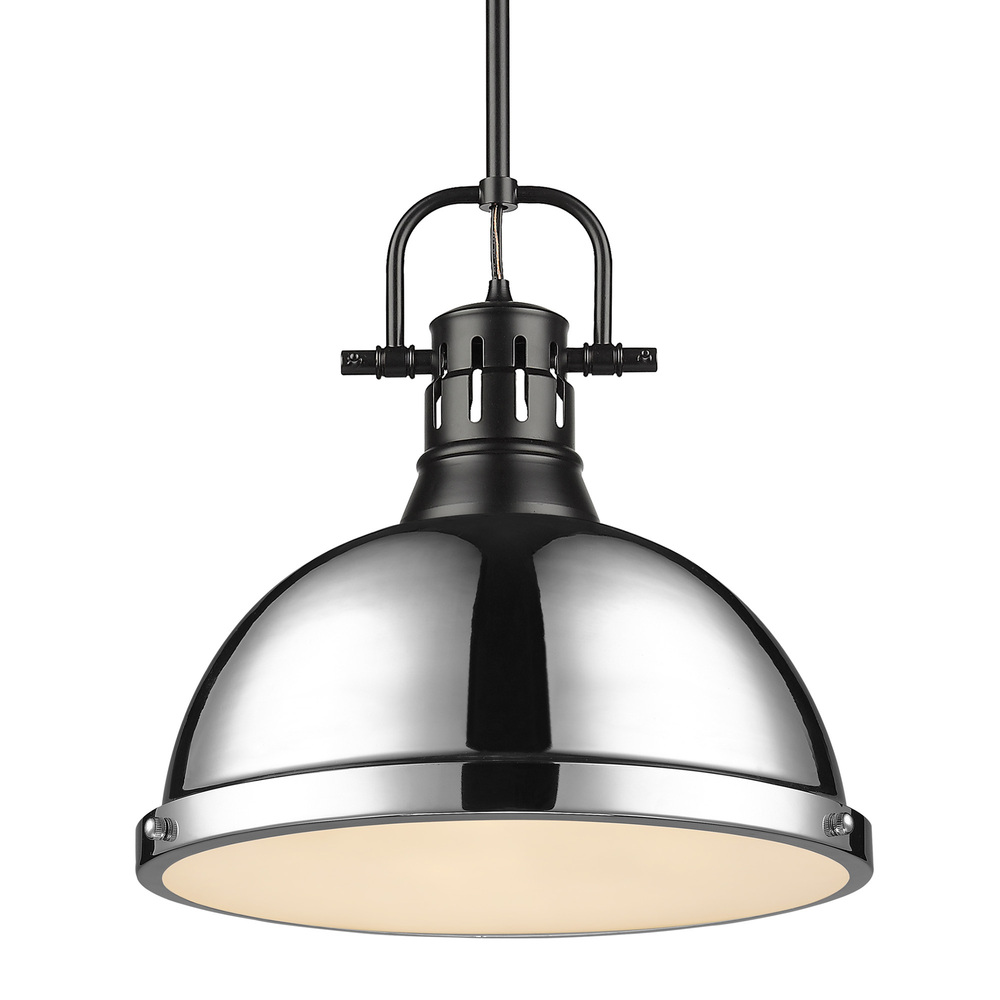Bring traditional elegance into your home with the Yep by Golden Lighting Duncan 1-light 14in Rod Hung Pendant. Featuring a striking chrome shade and a matte black frame, it creates a welcoming atmosphere. The brilliant chrome shade provides a high-shine glee that enhances light, creating a stunning visual effect within any décor. With an iconic barn light silhouette, this fixture is perfect for rustic or country-inspired designs. Add decisively stylish lighting to kitchens, dining areas, or entryways with this versatile piece. Damp location rated, it’s an excellent option for covered spaces. The fixture features adjustable height ranging from 22.875" to 58.875" and measures 14"W x 14.63"H x 14"D. It requires one E26 Medium base bulb (not included) with a maximum wattage of 100, allowing for bright illumination as desired. Elevate the aesthetics of your home with this captivating pendant light.