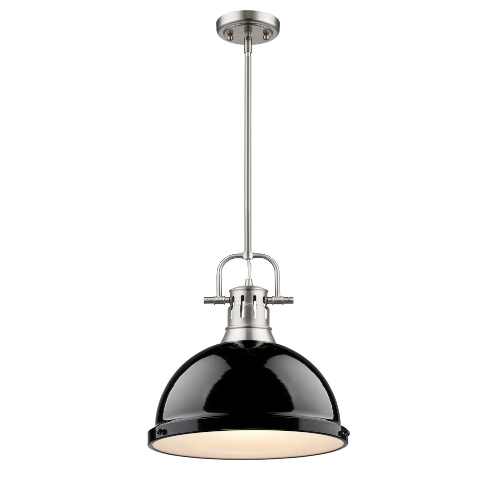 Bring farmhouse elegance into your home with the Yep by Golden Lighting Duncan 1-light 14in Rod Hung Pendant. Featuring a metal shade and a pewter frame, it creates a welcoming atmosphere. The metal shade displays a stylish Glossy Black finish characterized by its deep, pure black color and high-polish sheen, creating a dramatic effect that reflects light beautifully. Our Pewter finish offers a soft and classic alternative to brighter silver tones, providing understated and timeless appeal. Perfect for focused yet decorative illumination, this pendant is suitable for kitchens, dining rooms, and entryways while being damp location rated for covered spaces with occasional moisture. Enjoy accessible installation with its adjustable height from a minimum of 22.875" to a maximum of 58.875" on sloped ceilings, with overall dimensions of 14"W x 14.63"H x 14"D. It requires one E26 medium base bulb (not included), with a maximum wattage of 100. Elevate your decor with the sophisticated presence of this pendant light.