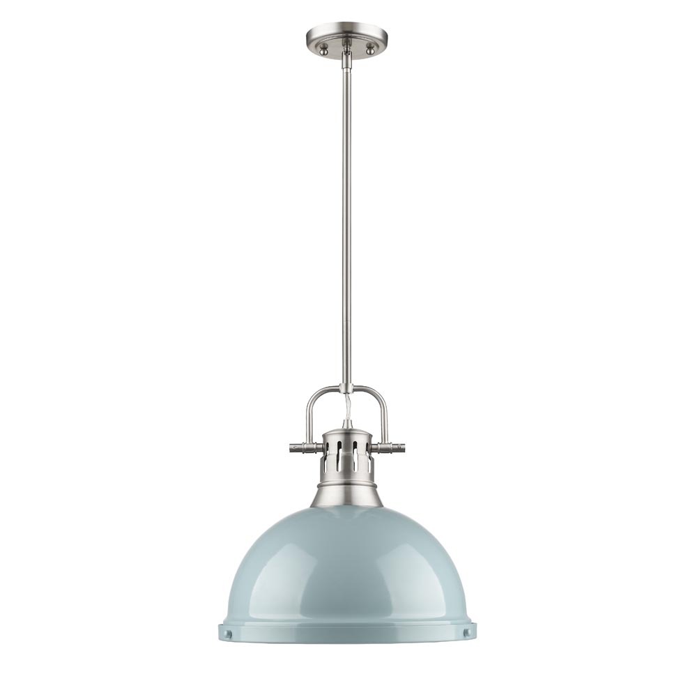 Bring farmhouse elegance into your home with the Yep by Golden Lighting Duncan 1-light 14in Rod Hung Pendant. Featuring a metal shade and a pewter frame, it creates a welcoming atmosphere. The metal shade is finished in Seafoam, featuring a light pastel blue-green color that adds a playful pop of color. Its highly reflective, enamel-like sheen provides a charming accent while illuminating your space. This fixture is ideal for kitchens, dining rooms, and bedrooms, and is Damp Location Rated, making it suitable for covered and semi-enclosed areas. The pendant is also sloped-ceiling compatible and features adjustable height options (Min: 22.875"- Max: 58.875"), ensuring easy installation tailored to your space. Overall Dimensions are 14"W x 14.63"H x 14"D, and it requires 1 E26 Medium base bulb (not included), with a maximum wattage of 100. Enhance your home with this stylish lighting option that blends quality craftsmanship with timeless design.