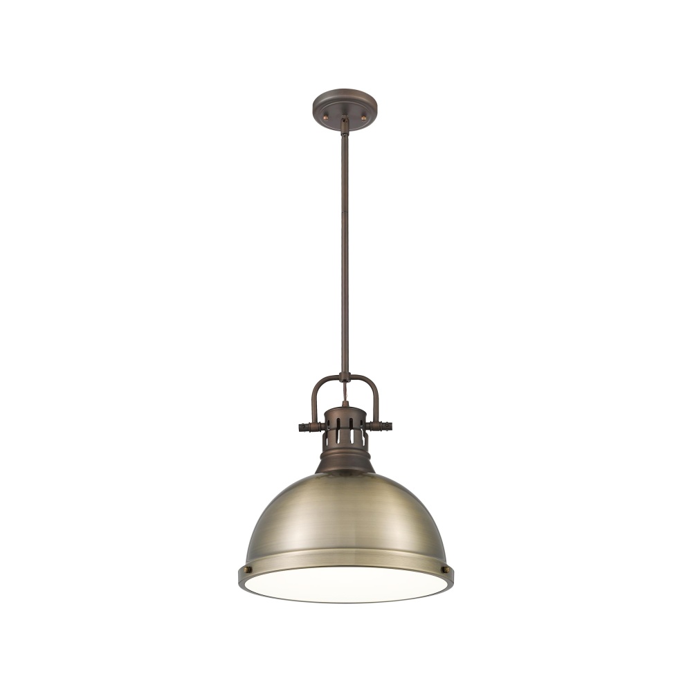 Bring traditional elegance into your home with the Yep by Golden Lighting Duncan 1-light 14in Rod Hung Pendant. Featuring an aged brass metal shade and a rubbed bronze frame, it creates a welcoming atmosphere that merges the old with the new. The Aged Brass metal shade adds a warm, antiqued glow, beautifully catching and diffusing light thanks to its low-luster satin sheen and fine circular brushed texture. The rich, deep brown of the rubbed bronze finish complements various styles, adding warmth and character to your decor. Perfect for kitchens, dining rooms, or bedrooms, this pendant light is damp location rated, suitable for spaces with occasional moisture. It is sloped-ceiling compatible and adjustable in height from 22.875" to 58.875" to suit your needs. The overall dimensions are 14"W x 14.63"H x 14"D, and it requires one E26 Medium base bulb (not included) with a maximum wattage of 100. Experience the beauty of rustic elegance with this timeless lighting fixture.