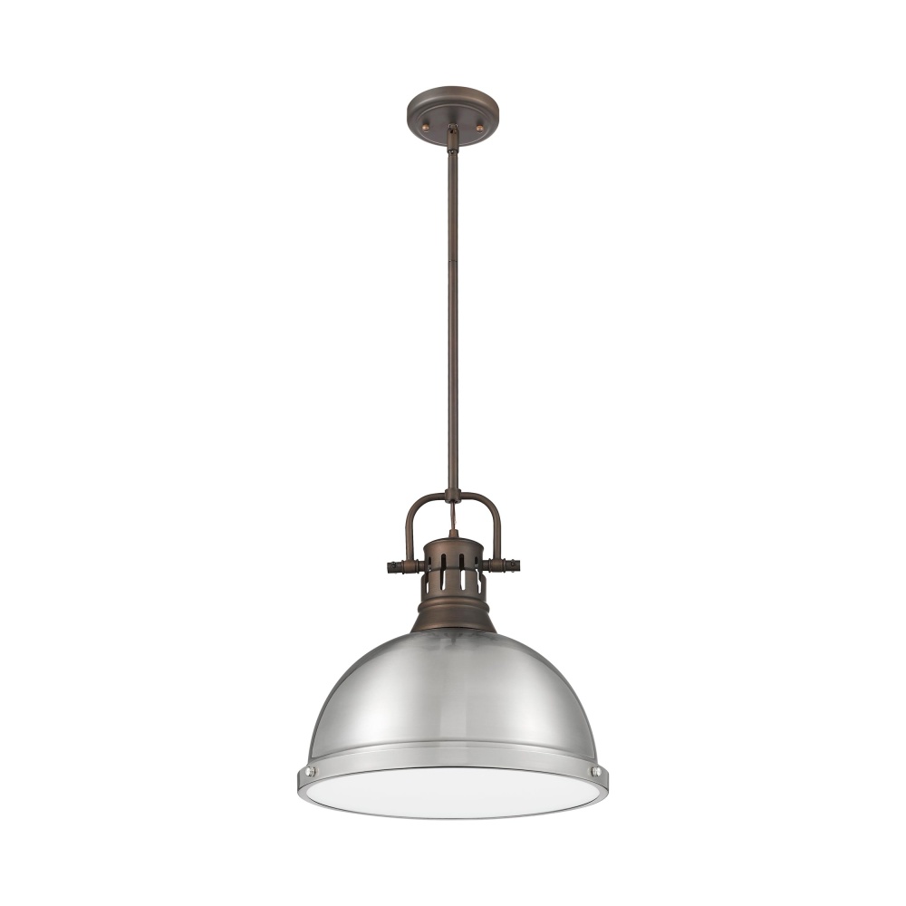 Bring rustic elegance into your home with the Yep by Golden Lighting Duncan 1-light 14in Rod Hung Pendant. Featuring a metal shade and a Rubbed Bronze frame, it creates a welcoming atmosphere. This metal shade beautifully diffuses light, showcasing a Pewter electroplated finish with a medium-toned, warm silver-grey color. The surface is distinguished by a fine, brushed texture that gently scatters light, creating an elegant, non-glare glow. A timeless and versatile choice, the Rubbed Bronze finish brings a touch of classic warmth, expertly brushing the deep brown base to reveal subtle highlights of warm, coppery bronze. Perfect for kitchens, dining rooms, or bedrooms, this pendant is damp location rated and suitable for covered spaces with occasional moisture. It features adjustable height, ranging from 22.875" to 58.875", allowing it to be installed on sloped ceilings for added versatility. Overall dimensions measure 14"W x 14.63"H x 14"D, and it requires a single E26 Medium base bulb (not included) with a maximum wattage of 100. Close with the timeless charm and quality construction that fits beautifully into country-inspired homes.