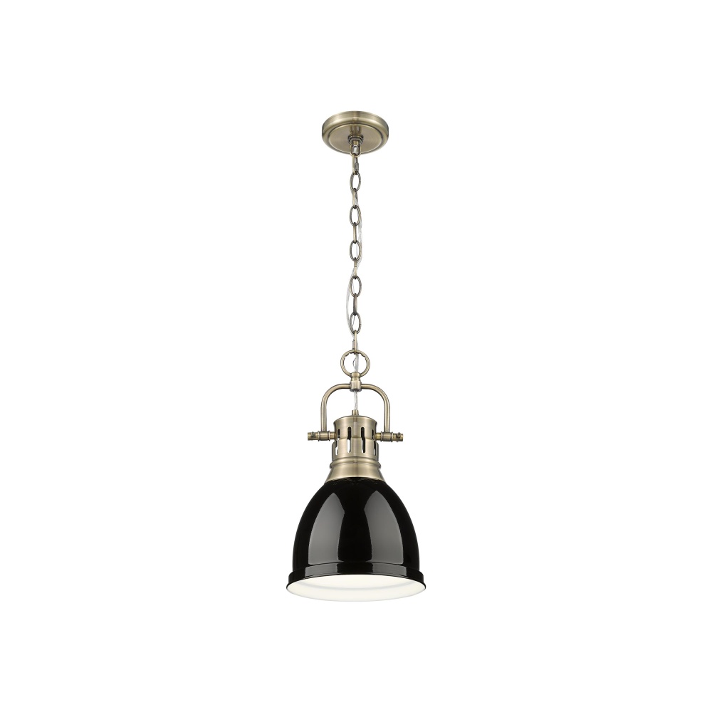 Bring farmhouse elegance into your home with the Yep by Golden Lighting Duncan 1-light 9in Chain Hung Pendant. Featuring a metal shade and an Aged Brass frame, it creates a welcoming atmosphere. The sleek metal shade in Glossy Black adds a dramatic flair, reflecting light and enhancing your interior. Its high-gloss finish creates a striking contrast, ensuring your lighting is not only functional but also a focal point in your decor. The Aged Brass finish, created through durable electroplating, embodies timeless elegance with a warm, inviting glow. This piece is perfect for traditional, transitional, or industrial-inspired spaces, adding character and luxury wherever placed. Ideal for kitchens, dining rooms, or bedrooms, this pendant is Damp Location Rated, suitable for covered areas with occasional moisture. It is also sloped-ceiling compatible and features an adjustable height from 19.5" to 91.5", allowing for flexibility in installation. Overall Dimensions: 8.88"W x 16.5"H x 8.88"D. Requires 1 E26 Medium base bulb (not included) with a maximum wattage of 100. Illuminate your space with timeless charm and high quality that speaks to your style.