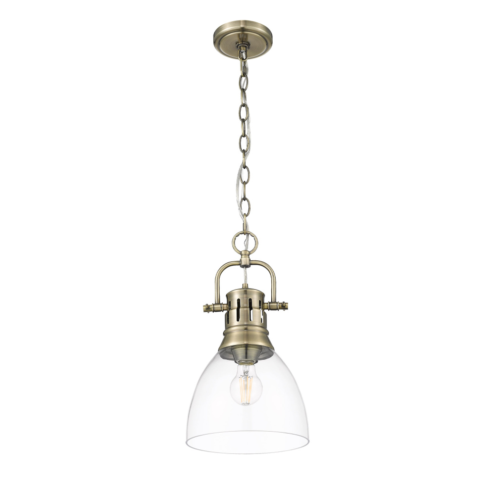 Bring farmhouse elegance into your home with the Yep by Golden Lighting Duncan 1-light 9in chain hung Pendant. Featuring a glass shade and an aged brass frame, it creates a welcoming atmosphere. The clear glass shade offers brilliant, unobstructed light, perfectly complementing the vintage-inspired design. With a timeless appeal, this glass shade allows the beauty of the fixture to shine through. Embrace timeless elegance with our Aged Brass finish, which offers a warm, inviting glow reminiscent of vintage heirlooms. Its durable electroplating process and subtle antiquing add depth to any space. Add a stylish statement to kitchens, dining rooms, or bedrooms — suitable for damp locations like bathrooms and covered porches. The pendant is sloped-ceiling compatible and features adjustable height from 19.5" to 91.5". Overall dimensions are 8.88"W x 16.5"H x 8.88"D, requiring 1 E26 Medium base bulb (not included) with a maximum wattage of 100. Experience quality and charm with this versatile light fixture.