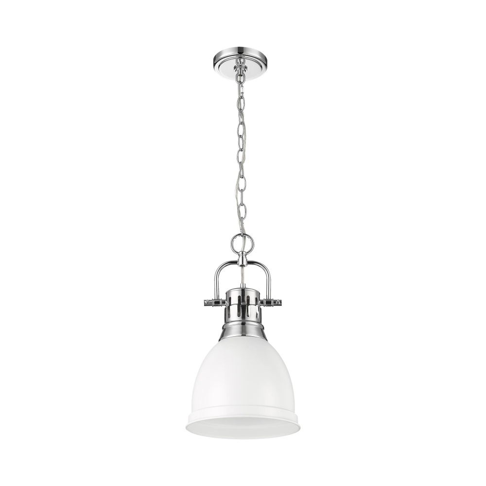 Bring vintage-inspired elegance into your home with the Yep by Golden Lighting Duncan 1-light 9in Chain Hung Pendant. Featuring a metal shade and a brilliant chrome frame, it creates a welcoming atmosphere. The matte white metal shade offers a smooth, non-reflective finish, enhancing its clean lines and modern look. The chrome finish provides a high-shine gleam that seamlessly integrates into various decor styles, from ultra-modern to classic traditional. Suitable for damp locations, this pendant light is perfect for covered and semi-enclosed spaces. It is sloped-ceiling compatible and features an adjustable height from 19.5" to 91.5". Overall dimensions are 8.88"W x 16.5"H x 8.88"D, requiring 1 E26 Medium base bulb (not included) with a maximum wattage of 100. Enjoy the stylish statement this light makes in kitchens, dining rooms, or entryways, reflecting quality and timeless design.