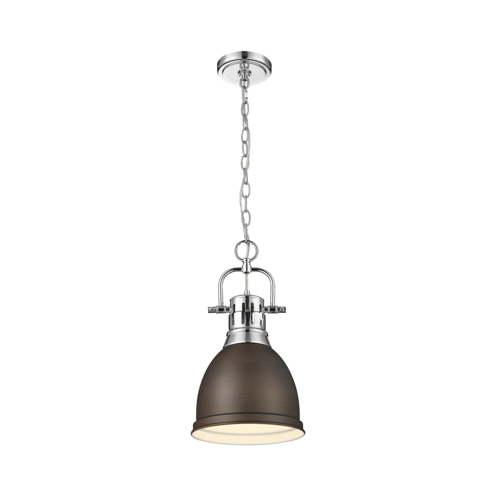 Bring farmhouse elegance into your home with the Yep by Golden Lighting Duncan 1-light 9in Chain Hung Pendant. Featuring a metal shade and a polished Chrome frame, it creates a welcoming atmosphere. The pendant is adorned with a Rubbed Bronze shade that brings a touch of classic warmth, showcasing a rich dark brown color with subtle highlights of coppery bronze for an inviting glow. Brilliant and timeless, the Polished Chrome finish shines with a sleek, mirror-like surface that integrates seamlessly into various decor styles. It is crafted with a durable electroplating process for easy maintenance, providing polished elegance to your home. Ideal for kitchens, dining rooms, or bedrooms, this pendant is damp location rated for areas like covered porches and laundry rooms. The design is adjustable in height from 19.5" to 91.5" and compatible with sloped ceilings. Overall Dimensions: 8.88"W x 16.5"H x 8.88"D. Requires 1 E26 Medium base bulb (not included), max wattage of 100. The Duncan pendant light is a blend of quality craftsmanship and timeless appeal, enhancing both the style and functionality of your space.