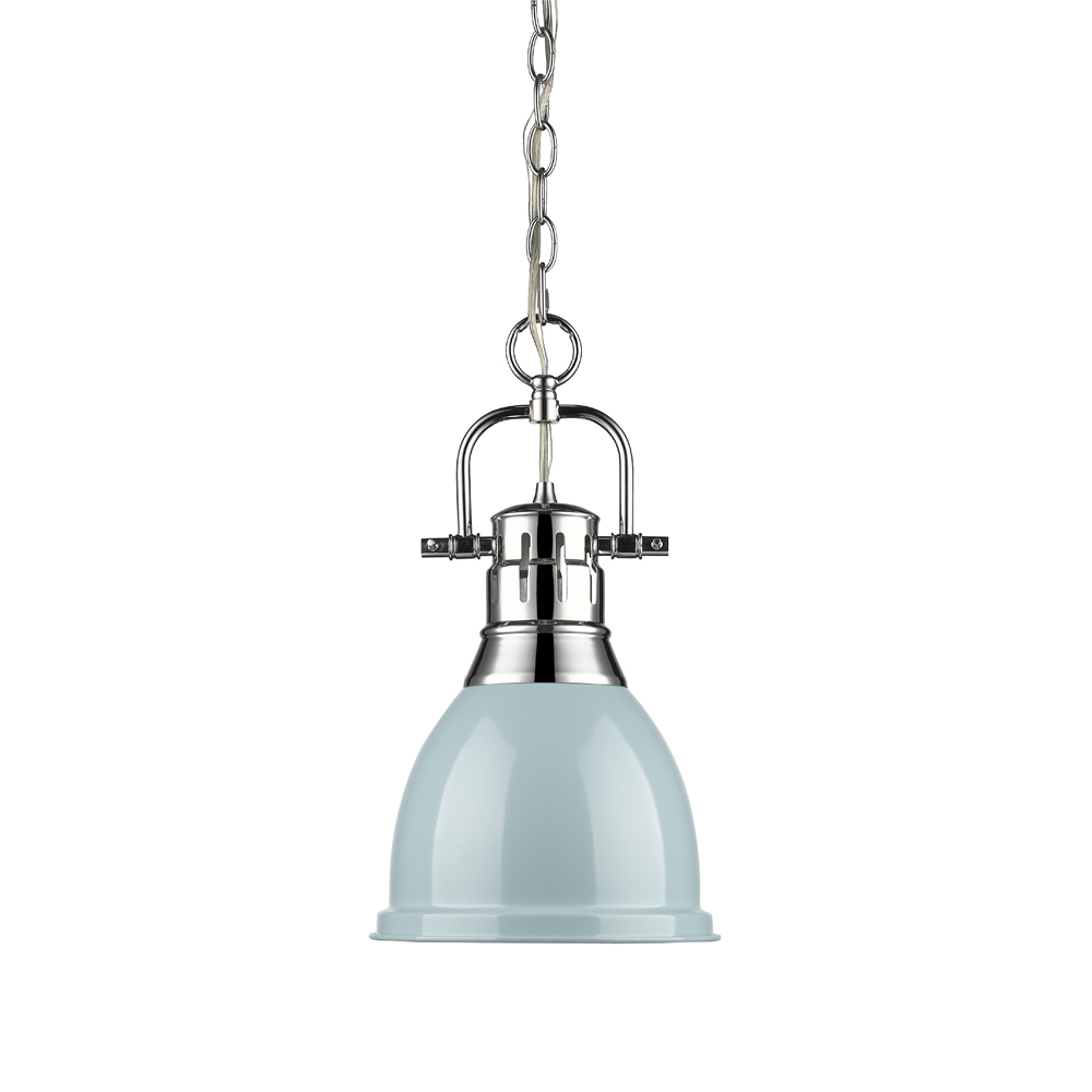 Bring coastal elegance into your home with the Yep by Golden Lighting Duncan 1-light 9in Chain Hung Pendant. Featuring a metal shade and a chrome frame, it creates a welcoming atmosphere. This soft seafoam metal shade shines with a smooth, high-gloss surface that captures light beautifully, adding a breezy touch to your decor. Its calming color is perfect for brightening kitchens and workspaces with lighthearted vintage-inspired style. The brilliant Polished Chrome finish offers a timeless look, enhancing various decor styles with its sleek and easy-to-clean surface. This finish adds brightness and polished perfection to any space. This pendant is perfect for creating a stylish statement in kitchens, dining rooms, or bedrooms, and is damp location rated for safe use in covered areas like bathrooms and porches. Sloped-ceiling compatibility and an adjustable height (Min: 19.5" - Max: 91.5") allow personalized installation. Overall Dimensions: 8.88"W x 16.5"H x 8.88"D. Requires 1 E26 Medium base bulb (not included). Max 100 wattage per bulb. The Duncan pendant light not only serves functional lighting needs but also enhances the overall aesthetic of your space with its unique design and quality craftsmanship.