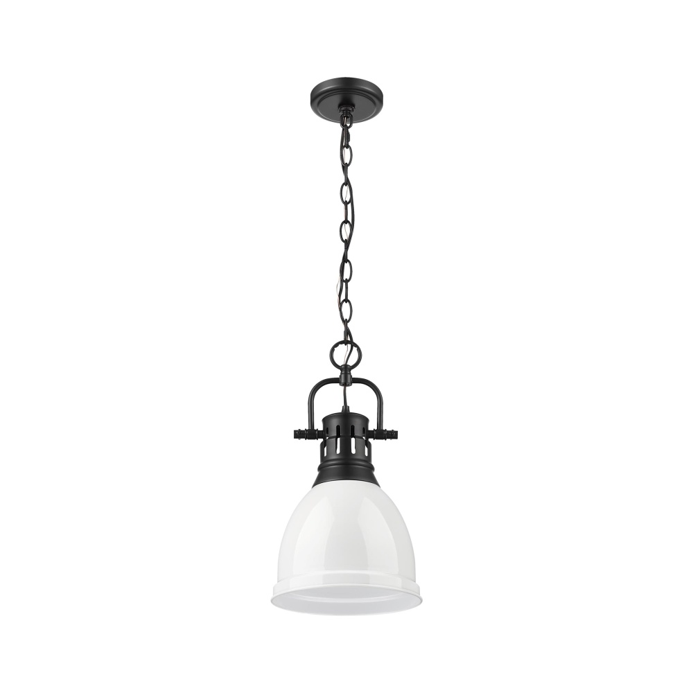 Bring farmhouse elegance into your home with the Yep by Golden Lighting Duncan 1-light 9in Chain Hung Pendant. Featuring a metal shade and a matte black frame, it creates a welcoming atmosphere. The metal shade offers a smooth, reflective surface that enhances light distribution while maintaining timeless utility. Our Matte Black finish epitomizes modern style, versatile enough to fit any decor. Perfect for kitchens, dining rooms, or bathrooms, this fixture is Damp Location Rated, ensuring safety in semi-enclosed spaces. Easily install on angled ceilings and customize the hanging length from 19.5" to 91.5". Overall dimensions are 8.88"W x 16.5"H x 8.88"D, requiring 1 E26 Medium base bulb with a maximum wattage of 100. Elevate your space with this classic lighting solution, designed with quality and style in mind.