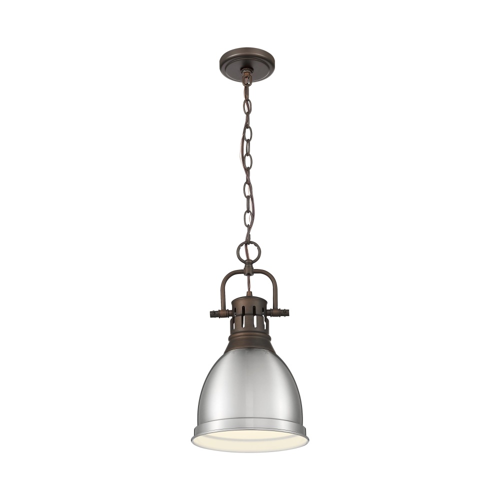 Bring farmhouse elegance into your home with the Yep by Golden Lighting Duncan 1-light 9in Chain Hung Pendant. Featuring a metal shade and a rubbed bronze frame, it creates a welcoming atmosphere. The pewter metal shade, with its medium-toned warm silver-grey color, gently diffuses light, casting a refined and non-glare glow. This timeless rubbed bronze finish brings a touch of classic warmth to any design, inviting soft illumination into your space. With versatility in mind, this pendant is damp location rated, perfect for covered and semi-enclosed spaces. It's easy to install on angled ceilings, and the adjustable height allows for customized hanging from 19.5" to 91.5". Overall dimensions of the fixture are 8.88"W x 16.5"H x 8.88"D, requiring 1 E26 medium base bulb (not included) up to 100 watts. Create a cozy and charming atmosphere in your kitchen, dining room, or entryway with this beautiful piece.