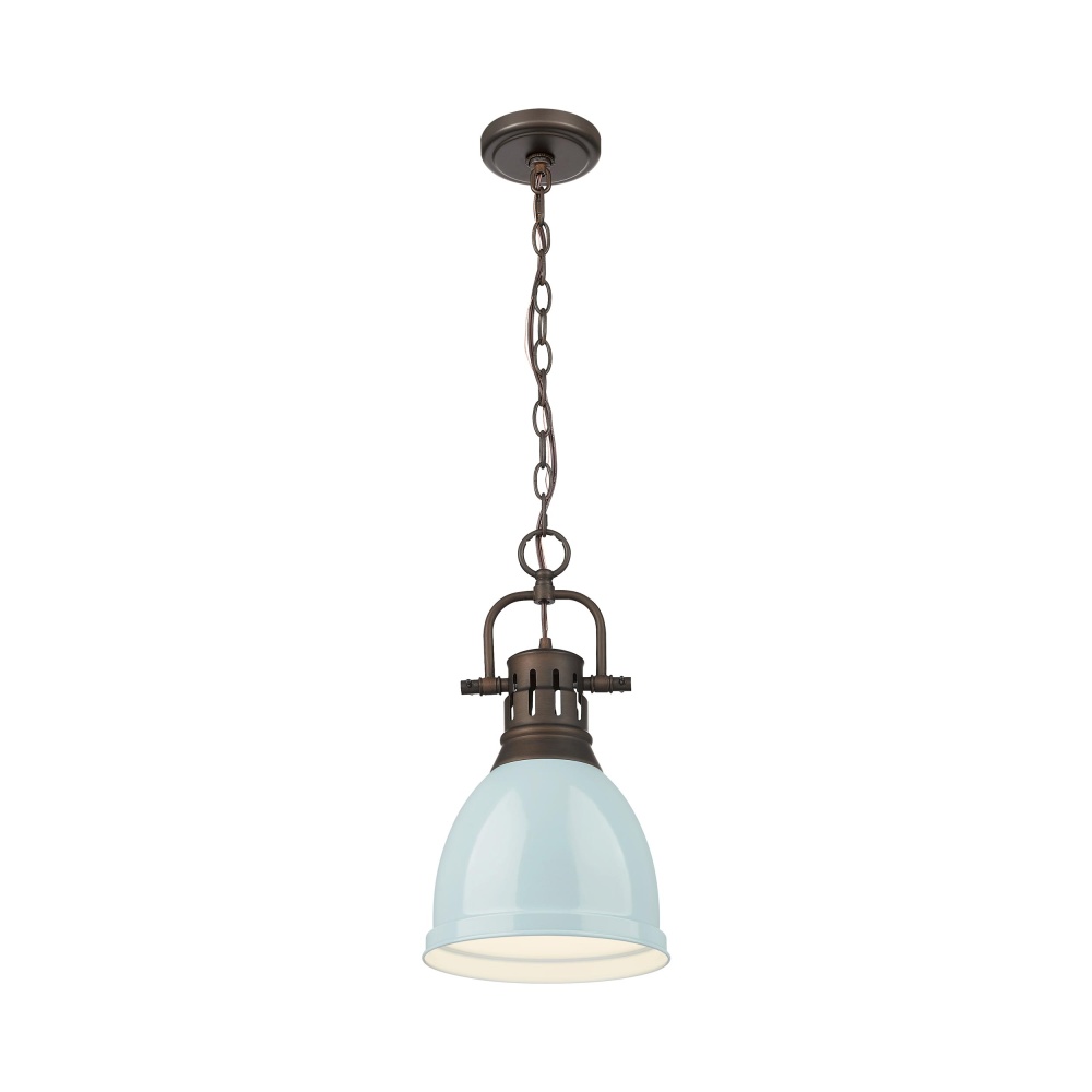Bring farmhouse elegance into your home with the Yep by Golden Lighting Duncan 1-light 9in Chain Hung Pendant. Featuring a metal shade and a rubbed bronze frame, it creates a welcoming atmosphere. The seafoam metal shade, with its light pastel blue-green color, gently diffuses light, casting a refined and non-glare glow. This timeless rubbed bronze finish brings a touch of classic warmth to any design, inviting soft illumination into your space. With versatility in mind, this pendant is damp location rated, perfect for covered and semi-enclosed spaces. It's easy to install on angled ceilings, and the adjustable height allows for customized hanging from 19.5" to 91.5". Overall dimensions of the fixture are 8.88"W x 16.5"H x 8.88"D, requiring 1 E26 medium base bulb (not included) up to 100 watts. Create a cozy and charming atmosphere in your kitchen, dining room, or entryway with this beautiful piece.