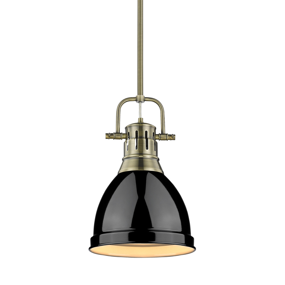 Bring traditional elegance into your home with the Yep by Golden Lighting Duncan 1-light 9in Rod Hung Pendant. Featuring a Black metal shade and an Aged Brass frame, it creates a welcoming atmosphere. The sleek Black shade introduces a dramatic contrast, enhancing the overall design while offering a reflective quality that beautifully interacts with light. Aged Brass provides a warm glow, capturing the charm of vintage designs and making this light perfect for traditional, transitional, or industrial-inspired spaces. Ideal for kitchens, dining rooms, and bedrooms, this pendant light is damp location rated for covered and semi-enclosed areas with occasional moisture. Installation is easy with sloped-ceiling compatibility and an adjustable height from 22.25" to 58.25" to customize your lighting setup. Overall dimensions measure 8.88"W x 14.25"H x 8.88"D, requiring one E26 Medium base bulb (not included) with a maximum wattage of 100. Illuminate your home with bold sophistication and timeless style.