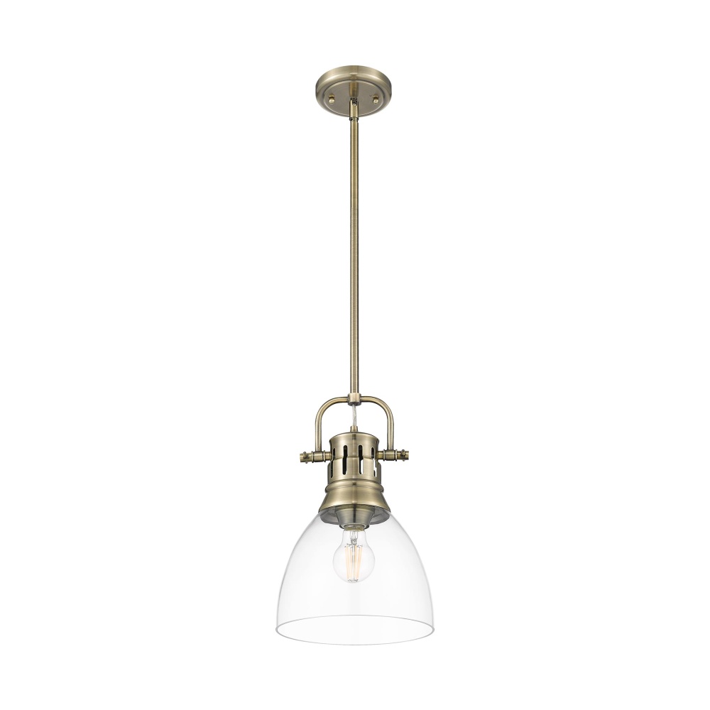 Bring rustic elegance into your home with the Yep by Golden Lighting Duncan 1-light 9in Rod Hung Pendant. Featuring a clear glass shade and an aged brass frame, it creates a welcoming atmosphere. The clear glass shade provides unobstructed light, showcasing the beauty of the bulb while contributing to the fixture's overall aesthetic. Embrace timeless elegance with the aged brass finish, reminiscent of vintage heirlooms. This sophisticated finish offers a warm, inviting glow that adds depth and character to any space. Perfect for kitchens, dining rooms, or bedrooms, the pendant is damp location rated, making it suitable for covered areas. Easily install it on angled ceilings with customizable hanging lengths from 22.25" to 58.25". Overall Dimensions: 8.88"W x 14.25"H x 8.88"D, requiring one E26 Medium base bulb (not included) with a maximum wattage of 100 watts. Close your living space with the rustic charm and quality craftsmanship of this stunning pendant light.