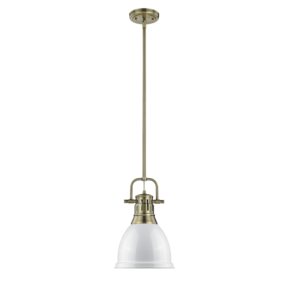 Bring farmhouse elegance into your home with the Yep by Golden Lighting Duncan 1-light 9in Rod Hung Pendant. Featuring a metal shade and an aged brass frame, it creates a welcoming atmosphere. The smooth white metal shade beautifully reflects light, providing excellent illumination while adding a clean, classic appeal to your space. Its surface is polished to a high-gloss sheen, reminiscent of vintage enamelware, making it as functional as it is stylish. Embrace timeless elegance with the aged brass finish, created through a durable electroplating process that adds warmth and character. This fixture is ideal for adding a touch of understated luxury to transitional or industrial-inspired spaces. Suitable for covered and semi-enclosed spaces, this damp-rated pendant can enhance entryways, foyers, kitchens, and even bathrooms with its focused yet decorative light. With an adjustable height from 22.25" to 58.25" and compatibility with sloped ceilings, installation is customizable to fit any room. Overall dimensions are 8.88"W x 14.25"H x 8.88"D, and it requires 1 E26 Medium base bulb (not included) with a maximum wattage of 100. Elevate your living space with this sophisticated and stylish pendant light that perfectly balances elegance and practical design.