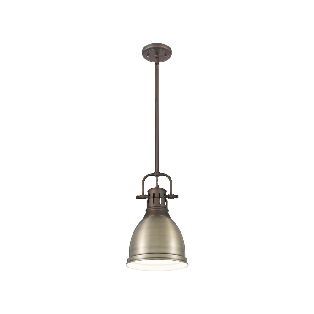 Bring timeless elegance to your home with the Yep by Golden Lighting Duncan 1-light 9in Rod Hung Pendant. Featuring a metal shade and a rubbed bronze frame, it creates a inviting atmosphere. The aged brass shade showcases a low-luster satin sheen with a warm, antiqued gold base, beautifully casting light while adding depth and character to your space. Our rubbed bronze finish, with its rich, deep brown tones and subtle highlights, offers a warm glow that complements various interior designs, from traditional farmhouse to industrial styles. Perfect for stylish kitchens, dining rooms, or bedrooms, this pendant is damp location rated, suitable for areas with occasional moisture, such as bathrooms and covered porches. Installation is made easy with its sloped-ceiling compatibility and adjustable height ranging from 22.25" to 58.25". With overall dimensions of 8.88"W x 14.25"H x 8.88"D, it requires 1 E26 Medium base bulb (not included, maximum wattage of 100). Experience both function and aesthetic charm with this quality pendant, making it a delightful addition to any room.