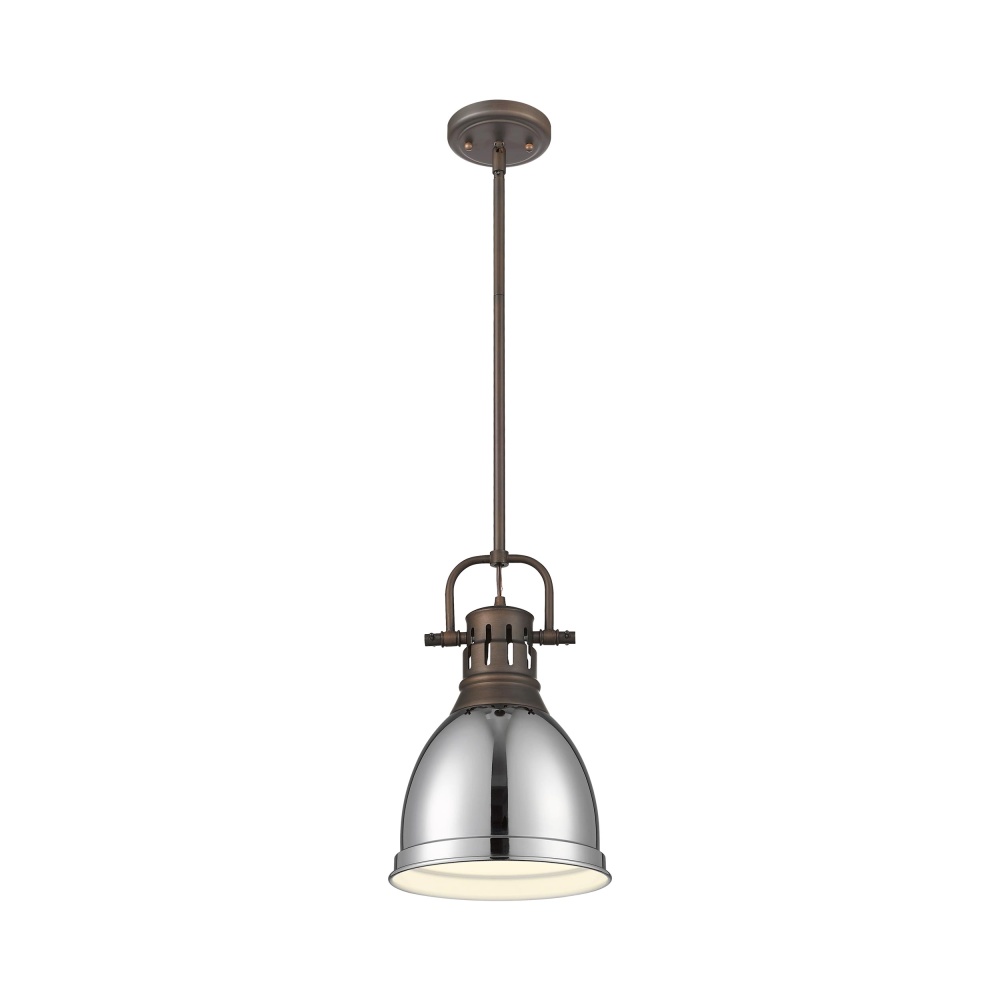 Bring farmhouse elegance into your home with the Yep by Golden Lighting Duncan 1-light 9in Rod Hung Pendant. Featuring a metal shade and a rubbed bronze frame, it creates a welcoming atmosphere. The metal shade reflects a beautiful, polished chrome interior, offering a bright and inviting brightness that's perfect for various settings. This pendant light showcases a timeless rubbed bronze finish that enhances the rustic charm, complementing a wide array of styles from traditional to industrial. Versatile for kitchens, dining rooms, or bedrooms, this fixture is Damp Location Rated, suitable for covered and semi-enclosed spaces. It’s easy to install on angled ceilings and boasts an adjustable height from 22.25" to 58.25". Overall Dimensions: 8.88"W x 14.25"H x 8.88"D. Requires 1 E26 Medium base bulb (not included), with a maximum wattage of 100. Enhance your decor with this quality piece that embodies stylish simplicity and eloquent craftsmanship.