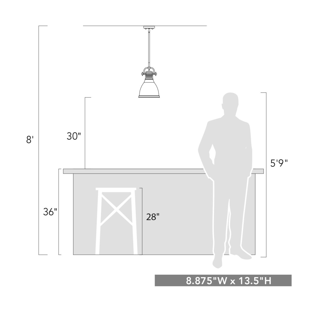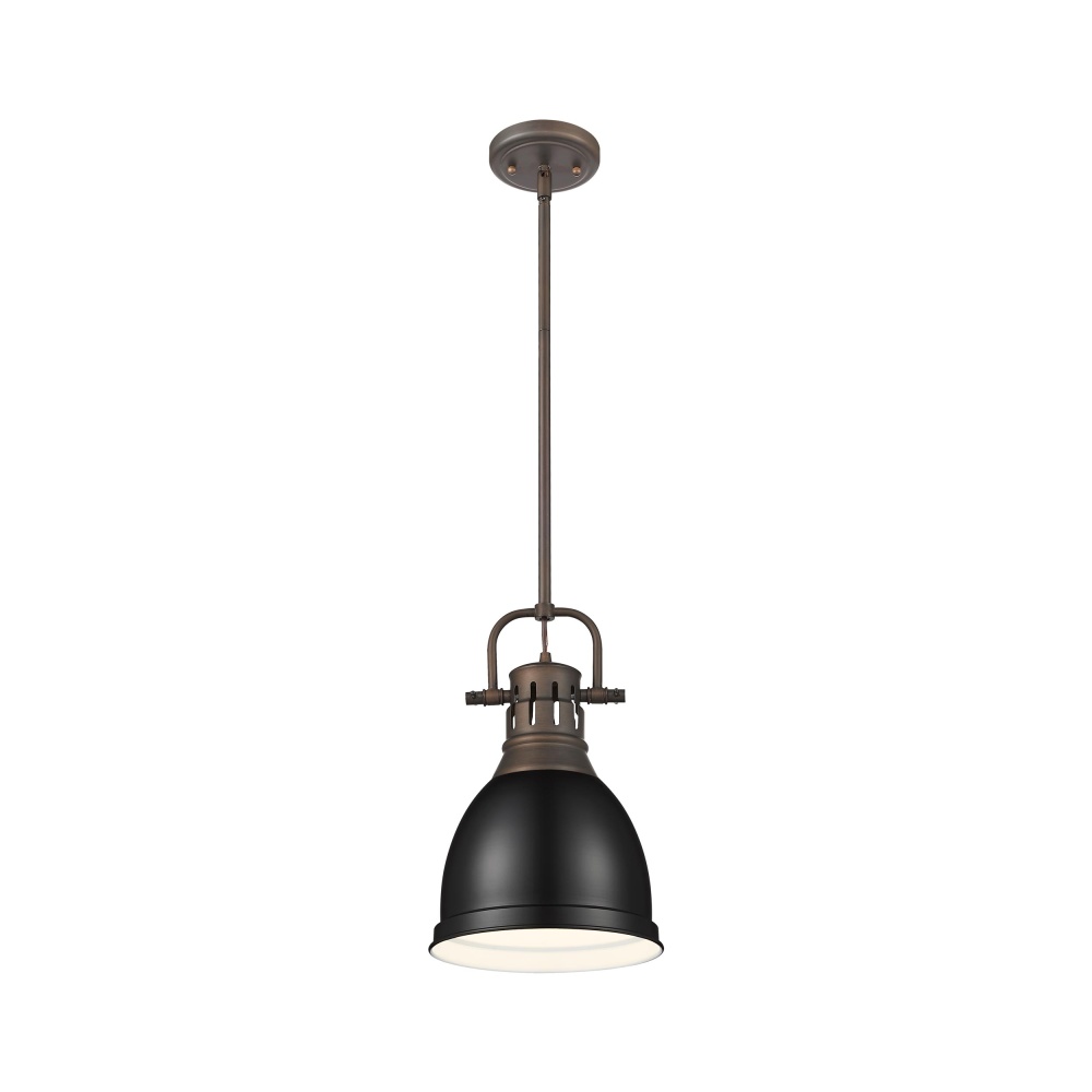 Bring farmhouse elegance into your home with the Yep by Golden Lighting Duncan 1-light 9in Rod Hung Pendant. Featuring a metal shade and a rubbed bronze frame, it creates a welcoming atmosphere. This pendant light showcases a sleek metal shade that features a classic matte black finish with a non-reflective surface, creating a soft and sophisticated look. The rubbed bronze finish enhances the timeless appeal, offering a rich, deep brown base with subtle highlights—perfect for various styles from rustic to industrial. Ideal for kitchens, dining rooms, and entryways, this light is damp location rated for covered spaces. It's sloped-ceiling compatible, and adjustable from 22.25" to 58.25". Overall dimensions are 8.88"W x 14.25"H x 8.88"D, requiring 1 E26 medium base bulb (not included) with a max wattage of 100, delivering focused yet decorative illumination. Elevate your space with this stylish and functional fixture.