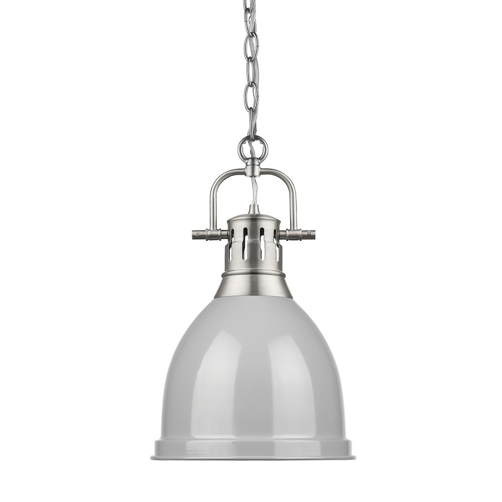Bring Farmhouse elegance into your home with the Yep by Golden Lighting Duncan 1-light Pendant. Featuring a gray metal shade and a pewter frame, it creates a welcoming atmosphere. The gray metal shade provides a smooth, reflective surface that offers a stylish light effect. This gorgeous pewter finish offers a soft and classic alternative to brighter silver tones, creating an elegant, non-glare glow. Perfect for covered and semi-enclosed spaces, this pendant is ideal for kitchens, dining rooms, or bedrooms, and is rated damp location suitable. Installation is easy with sloped-ceiling compatibility, and the height is adjustable from 19.5" to 91.5". Overall, it measures 8.88"W x 16.5"H x 8.88"D and requires 1 E26 medium base bulb (not included, max 100 wattage). Add a touch of timeless, rustic charm to your space with high-quality materials and sophisticated design.