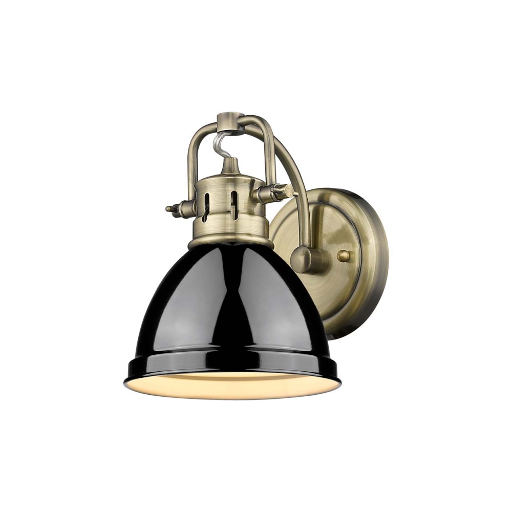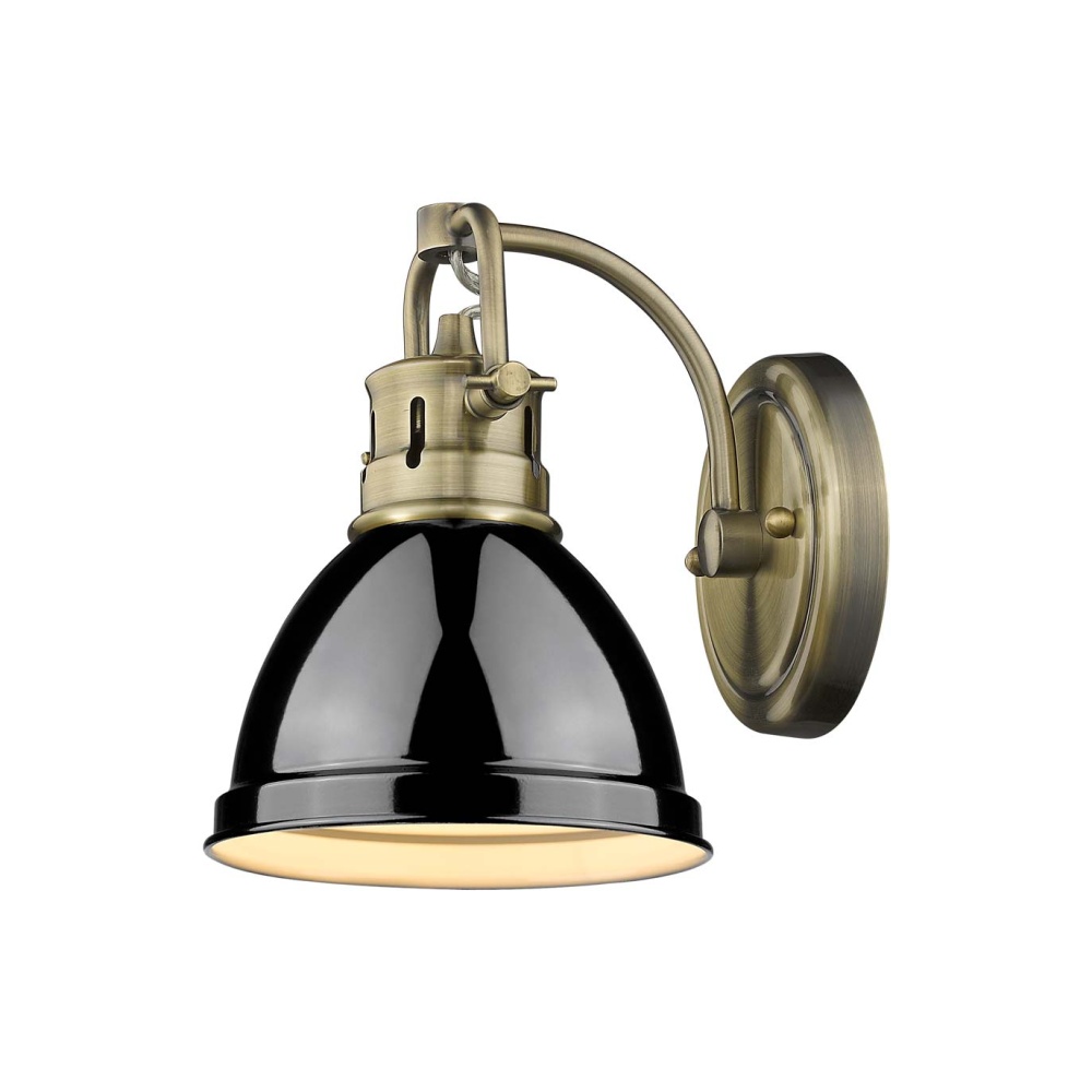 Bring traditional elegance into your home with the Yep by Golden Lighting Duncan 1-light Vanity. Featuring a metal shade and an Aged Brass frame, it creates a welcoming atmosphere. The metal shade showcases a Glossy Black finish with a highly reflective, polished sheen, beautifully reflecting light and creating a bold statement. The Aged Brass finish offers a warm, inviting glow, reminiscent of vintage heirlooms and enhances the timeless character of this fixture. This vanity light is perfect for brightening up bathrooms with practical task lighting while being damp location rated, making it suitable for covered spaces. The adjustable directional heads allow you to customize lighting to highlight specific areas. Overall Dimensions: 6.5"W x 8.5"H x 8.25"D, requires 1 E26 Medium base bulb (not included), max 100 wattage. Elevate your space with this blend of style and functionality.
