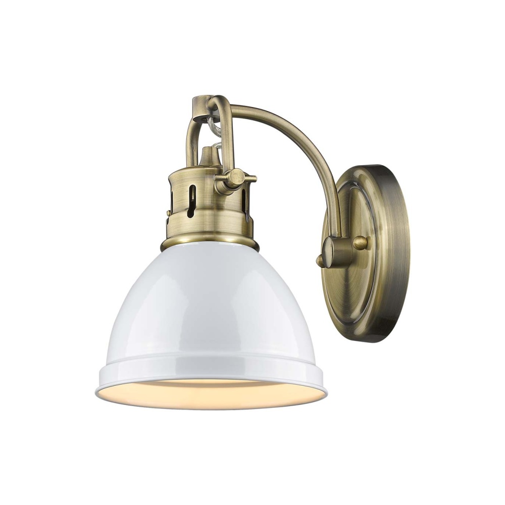 Bring traditional elegance into your home with the Yep by Golden Lighting Duncan 1-light Vanity. Featuring a metal shade and an Aged Brass frame, it creates a welcoming atmosphere. The metal shade reflects light beautifully, while the bright White finish adds a clean and classic touch, enhancing the ambiance of any space. This high-gloss surface is easy to clean and provides excellent light reflection. Embrace the timeless Aged Brass finish, which offers warmth reminiscent of vintage heirlooms, making it a perfect fit for traditional and transitional design themes. Brighten up bathrooms with dedicated lighting that flatters while providing practical task illumination. Damp Location Rated for covered and semi-enclosed spaces, it ensures safety in areas with occasional moisture. Customize your lighting experience with Adjustable Directional Heads for optimal focus on specific areas. Overall Dimensions: 6.5"W x 8.5"H x 8.25"D, requiring 1 E26 Medium base bulb (not included), with a maximum wattage of 100. Add both charm and functionality to your bathroom with this exceptional fixture.