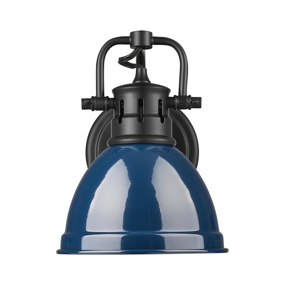 Bring vintage-inspired charm into your home with the Yep by Golden Lighting Duncan 1-light Vanity. Featuring a navy blue metal shade and a matte black frame, it creates a welcoming atmosphere. The navy blue metal shade adds a rich pop of color, enhancing the lighting with its high-gloss sheen that reflects its surroundings beautifully. The matte black finish is timeless and versatile, providing a smooth feel that works with various decor styles, from bold contemporary to traditional farmhouses. Ideal for bathrooms, this fixture is damp location rated, suitable for covered spaces with occasional moisture. Customize your lighting experience with adjustable directional heads that highlight specific areas. Overall Dimensions: 6.5"W x 8.5"H x 8.25"D. It requires 1 E26 Medium base bulb (not included), with a max wattage of 100. Experience the quality and character of this classic fixture that complements modern and vintage interiors alike.