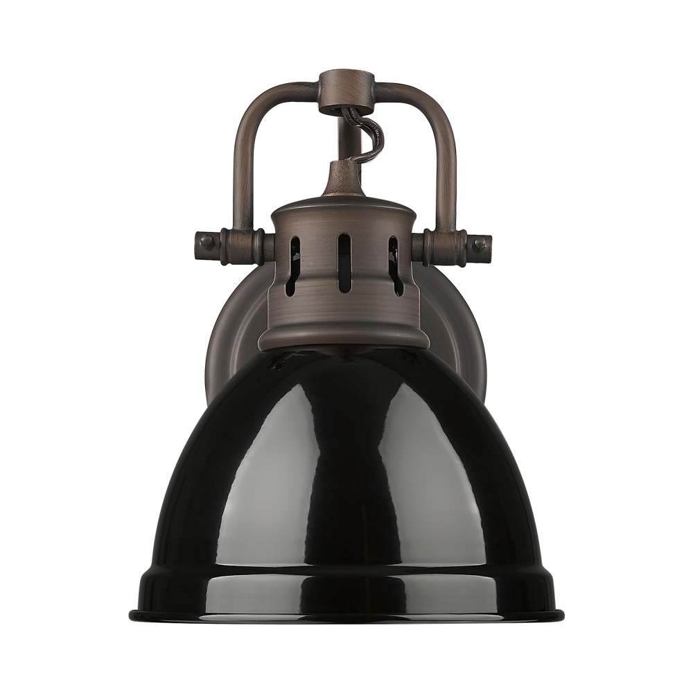 Bring a touch of vintage charm into your home with the Yep by Golden Lighting Duncan 1-light Vanity. Featuring a black metal shade and a Rubbed Bronze frame, it sets the perfect tone for any space. The glossy black shade delivers a high-contrast glow while casting light beautifully across its surroundings. The Rubbed Bronze finish provides a classic, warm feel that complements various styles—from industrial to modern. Ideal for bathrooms, this fixture is Damp Location Rated, ensuring safety in environments with occasional moisture. The adjustable directional heads allow tailored illumination, making it both practical and stylish. Overall dimensions are 6.5"W x 8.5"H x 8.25"D, and it requires one E26 Medium base bulb (not included) with a maximum wattage of 100. Upgrade your space with this eye-catching fixture, built for quality and longevity.