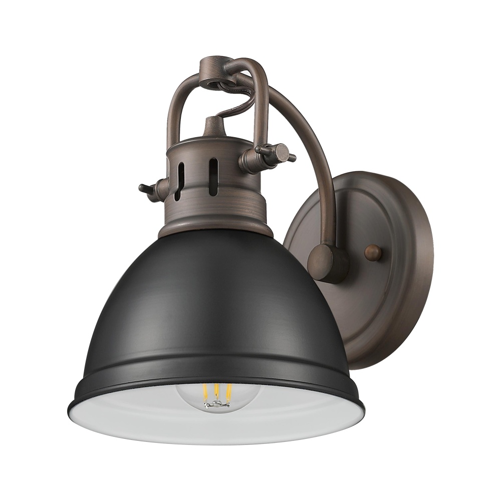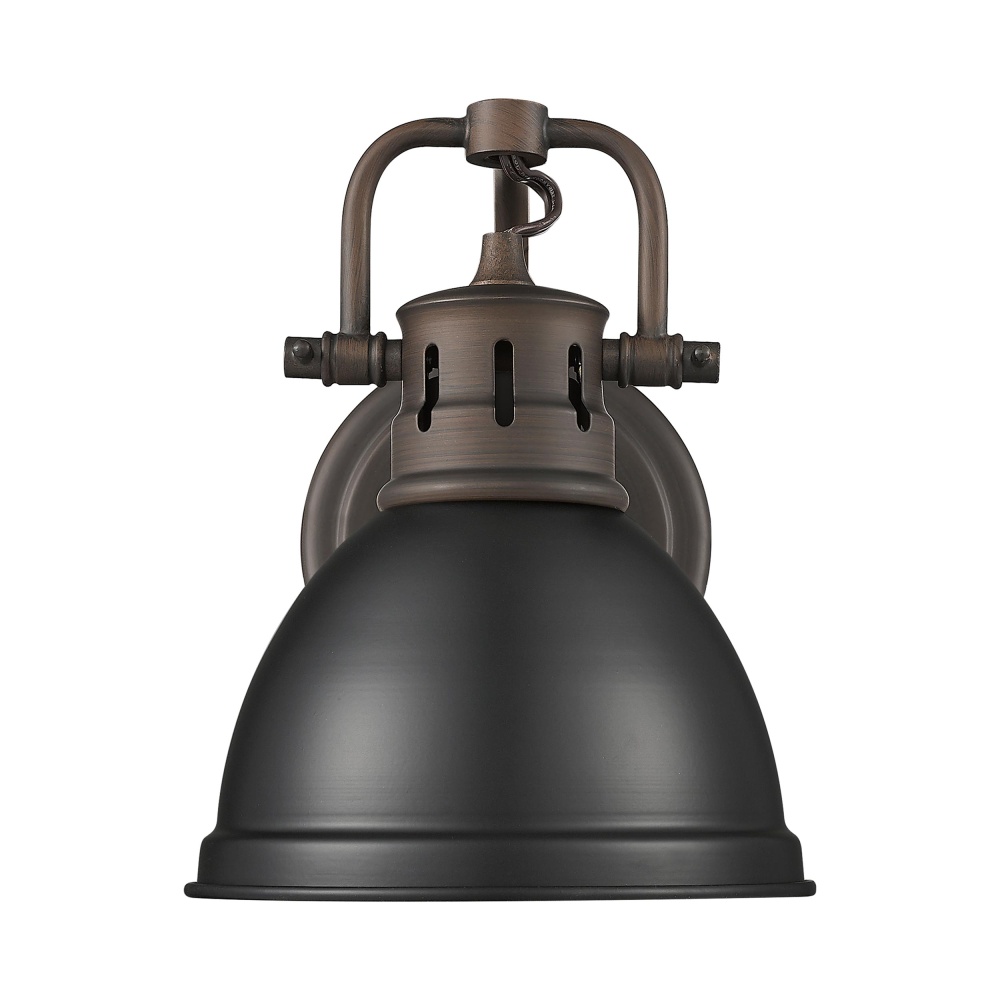 Bring classic charm to your home with the Yep by Golden Lighting Duncan 1-light Vanity. Featuring a matte black metal shade and a Rubbed Bronze frame, it provides a warm and inviting atmosphere. The matte black shade offers a refined, sophisticated glow, absorbing light beautifully to create a serene ambiance. The Rubbed Bronze finish transcends styles, making it a versatile choice for modern and farmhouse spaces alike. Ideal for bathrooms, this fixture is Damp Location Rated for safety in moisture-prone areas. The adjustable directional heads allow you to focus the light wherever needed. The overall dimensions are 6.5"W x 8.5"H x 8.25"D, and it requires one E26 Medium base bulb (not included) with a maximum wattage of 100. Enhance your space with this stylish and functional fixture, designed for durability and elegance.