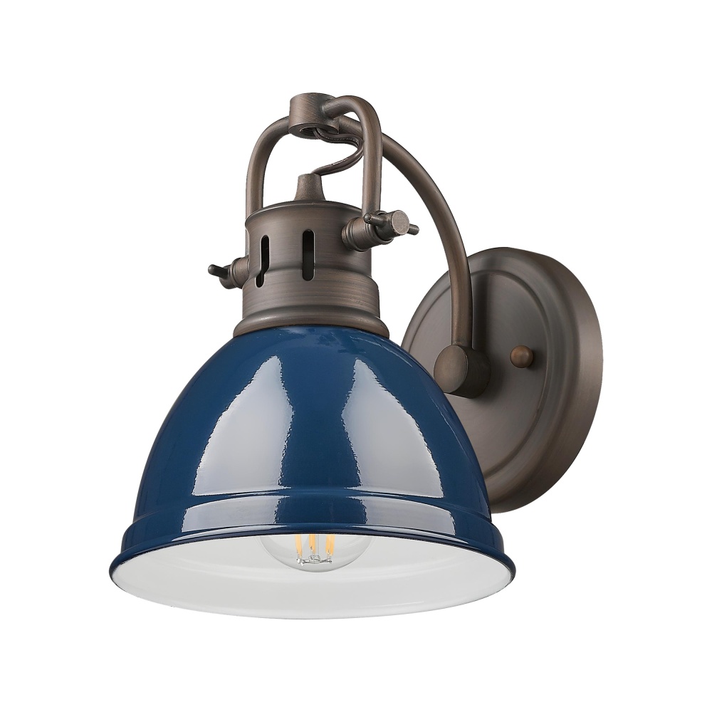 Bring farmhouse elegance into your home with the Yep by Golden Lighting Duncan 1-light Vanity. Featuring a metal shade and a Rubbed Bronze frame, it creates a welcoming atmosphere. The navy blue metal shade adds a sophisticated pop of color, boasting a high-gloss sheen that enhances its surroundings while providing durable and stylish illumination. This distinctive design makes it suitable for a variety of decorative styles, from contemporary to traditional. With its Rubbed Bronze finish, this fixture radiates warmth, making it ideal for rustic-inspired interiors while maintaining versatility. Brighten up bathrooms with dedicated lighting that flatters while providing practical task illumination. It is Damp Location Rated, suitable for covered and semi-enclosed spaces such as bathrooms and laundry rooms. You can easily customize this lighting with adjustable directional heads that can pivot to highlight specific areas. Overall Dimensions: 6.5"W x 8.5"H x 8.25"D. Requires 1 E26 Medium base bulb (not included), with a maximum wattage of 100. This lighting fixture not only enhances the visibility in your space but also stands out as a stylish focal point in your home décor.