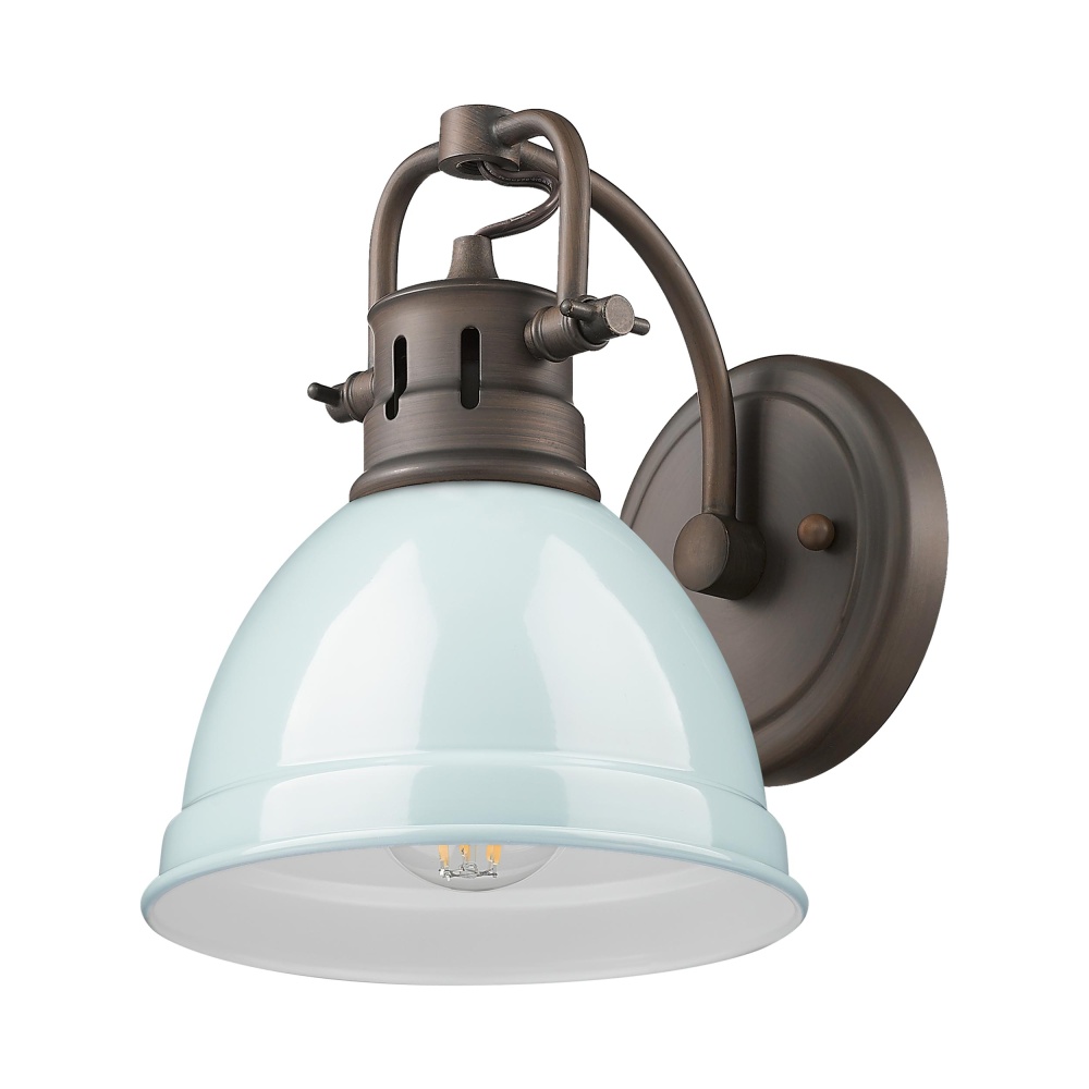 Bring coastal elegance into your home with the Yep by Golden Lighting Duncan 1-light Vanity. Featuring a Seafoam metal shade and a Rubbed Bronze frame, it creates a light and inviting atmosphere. The Seafoam shade showcases a soft, pastel blue-green color with a high-gloss finish, adding a breezy charm that illuminates your space beautifully. With its rustic charm, this fixture effortlessly enhances the aesthetic of bathrooms with a vintage touch. Damp Location Rated, it’s designed for covered areas with occasional moisture. The Adjustable Directional Heads allow you to customize the lighting to highlight specific areas with ease. Dimensions: 6.5"W x 8.5"H x 8.25"D, Requires 1 E26 Medium base bulbs (not included) with a maximum wattage of 100. Elevate your bathroom decor with this stylish and functional lighting solution that brings a pop of color and sophistication to your space.
