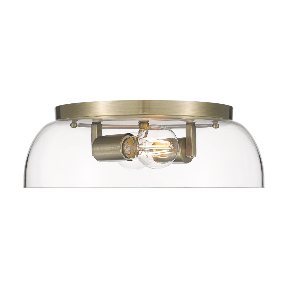 Bring timeless elegance into your home with the Yep by Golden Lighting Duncan 2-light Flush Mount. Featuring a glass shade and an aged brass frame, it creates a welcoming atmosphere. The clear glass shade offers brilliant, unobstructed light, with a smooth, polished surface that complements various styles. The polished finish highlights the beauty of the bulb and the fixture's design. Embrace the sophistication of the Aged Brass finish, which adds a touch of luxury and character, making it perfect for traditional and farmhouse settings. Ideal for low ceilings in hallways, closets, laundry areas, and bathrooms, this fixture is damp location rated for covered spaces. Requires 2 E26 Medium base bulbs (not included) with a maximum wattage of 60. Overall Dimensions: 14"W x 4.25"H x 14"D. Enhance your home with this quality fixture that combines function and style beautifully.