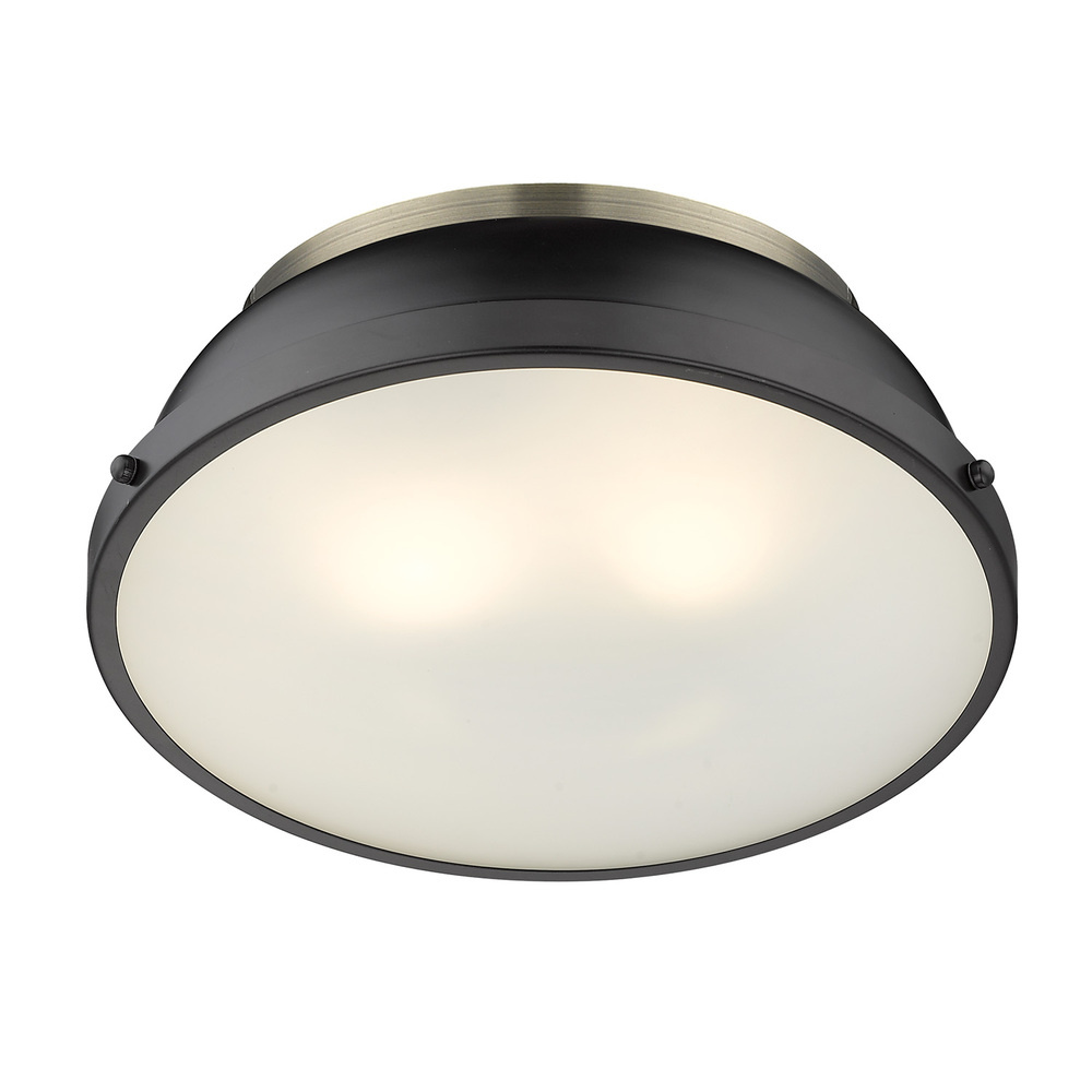 Bring farmhouse elegance into your home with the Yep by Golden Lighting Duncan 2-light Flush Mount. Featuring a metal shade and an aged brass frame, it creates a welcoming atmosphere. This flush mount light showcases a sleek metal shade in a matte black finish, offering a clean, modern style that absorbs light and creates a sophisticated look. The smooth, non-reflective surface adds understated elegance to any interior. Crafted in an Aged Brass finish, it's designed to bring timeless elegance that complements traditional, transitional, or industrial-inspired decor. Ideal for rooms with low ceilings such as hallways, closets, and laundry areas, this light is also rated for damp locations, making it perfect for covered porches and bathrooms. Installation is easy, requiring 2 E26 medium base bulbs (not included) with a maximum wattage of 60 per bulb. Overall dimensions measure 14"W x 4.25"H x 14"D, ensuring a compact design that meets wide illumination needs. Elevate your interiors with the quality craftsmanship of the Yep by Golden Lighting.
