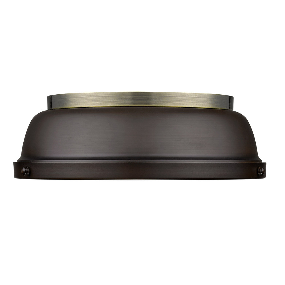 Bring traditional elegance into your home with the Yep by Golden Lighting Duncan 2-light Flush Mount. Featuring a Metal shade and an Aged Brass frame, it creates a welcoming atmosphere. The Metal shade provides a soft glow, beautifully diffusing light to enhance your space. The Rubbed Bronze finish features a rich, dark brown color with subtle, warm coppery highlights, delivering an inviting, classic allure. Embrace timeless elegance with our Aged Brass finish, which offers a warm glow reminiscent of vintage heirlooms and classic hardware. Ideal for low ceilings, this fixture is damp location rated, suitable for covered areas with occasional moisture, like bathrooms and laundry rooms. Overall Dimensions: 14"W x 4.25"H x 14"D. Requires 2 E26 Medium base bulbs (not included), with a maximum wattage of 60 per bulb. Elevate your home decor with this timeless piece that seamlessly blends function and style, adding a touch of rustic charm to any room.