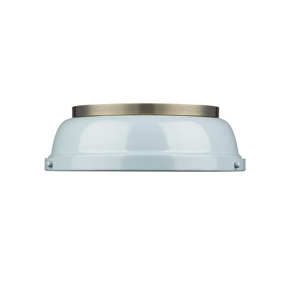 Bring traditional elegance into your home with the Yep by Golden Lighting Duncan 2-light Flush Mount. Featuring a Metal shade and an Aged Brass frame, it creates a welcoming atmosphere. The Metal shade provides a soft glow, beautifully diffusing light to enhance your space. The Seafoam finish, characterized by a light blue-green color with a high-gloss shine, adds cheerful coastal charm and a vintage touch to your interior. Embrace timeless elegance with our Aged Brass finish, which offers a warm glow reminiscent of vintage heirlooms and classic hardware. Ideal for low ceilings, this fixture is damp location rated, suitable for covered areas with occasional moisture, like bathrooms and laundry rooms. Overall Dimensions: 14"W x 4.25"H x 14"D. Requires 2 E26 Medium base bulbs (not included), with a maximum wattage of 60 per bulb. Elevate your home decor with this timeless piece that seamlessly blends function and style, adding a pop of color to any space.