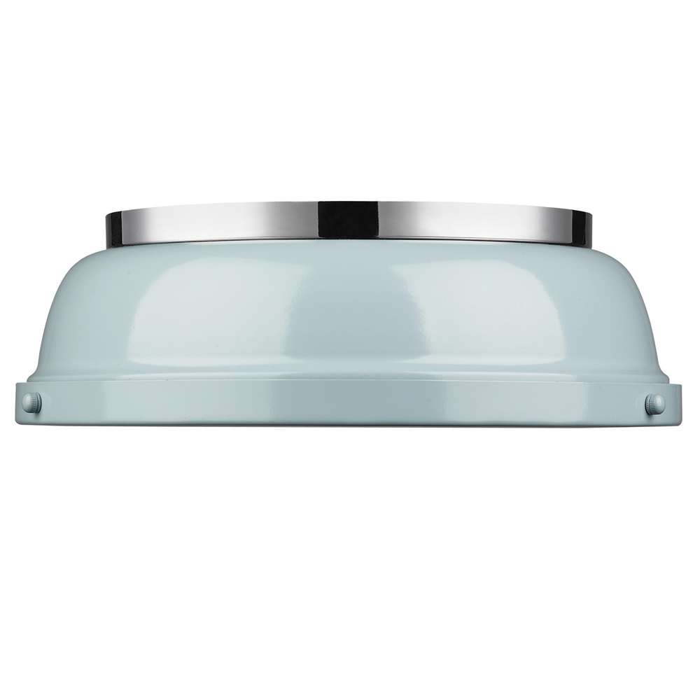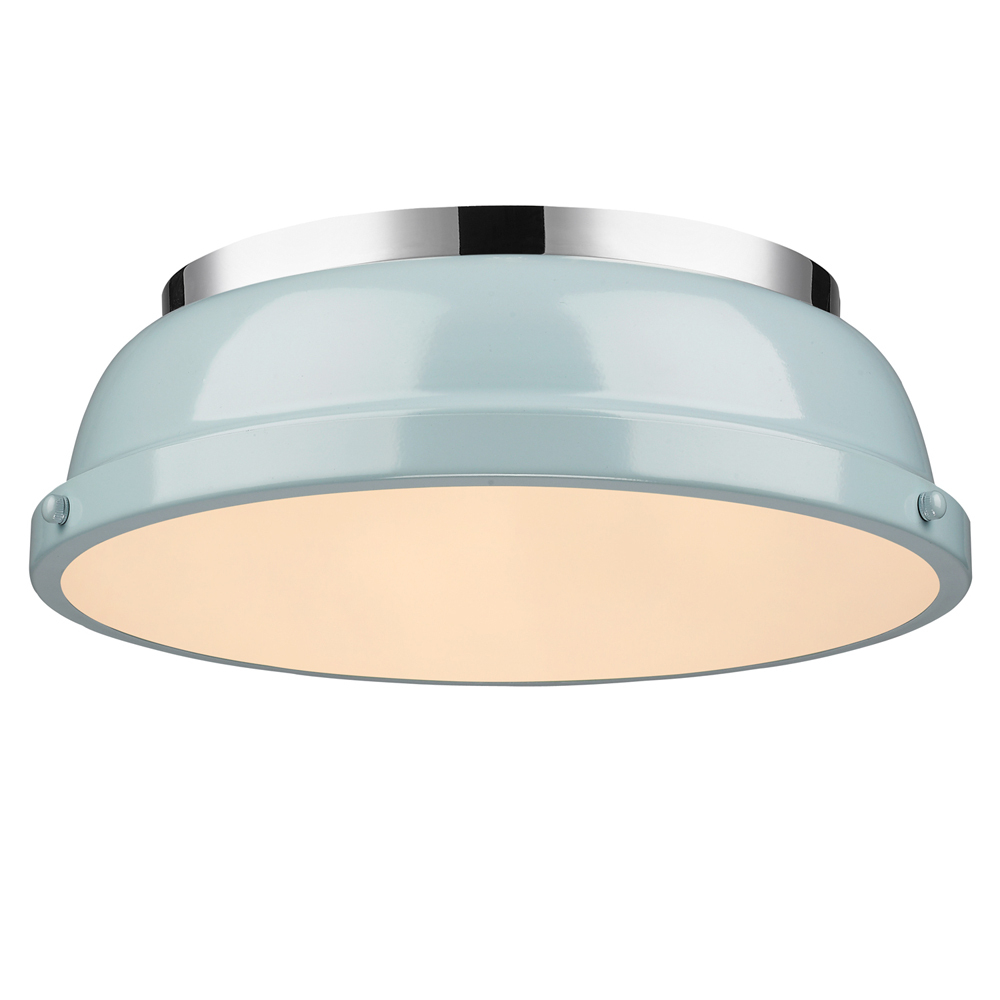 Bring farmhouse elegance into your home with the Yep by Golden Lighting Duncan 2-light Flush Mount. Featuring a metal shade and a chrome frame, it creates a welcoming atmosphere. The metal shade features a seafoam finish that reflects light with a high-gloss sheen, reminiscent of vintage enamelware. Brilliant and timeless, the Polished Chrome finish elevates any space with its highly reflective surface, making it incredibly versatile and easy to integrate into various decor styles. Ideal for low ceilings in hallways, closets, and bathrooms, this fixture is damp location rated, perfect for areas with occasional moisture. It measures 14"W x 4.25"H x 14"D and requires 2 E26 Medium base bulbs (not included) with a maximum wattage of 60. This quality fixture not only illuminates but also enhances the charm of any space.