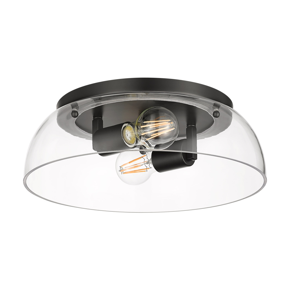 Elevate your space with rustic elegance through the Yep by Golden Lighting Duncan 2-light Flush Mount. Featuring a glass shade and a matte black frame, it creates a welcoming atmosphere. The clear glass shade allows for unobstructed light, showcasing the beautiful bulbs while adding brilliance to any room. This matte black finish is timeless and versatile, perfectly smooth to the touch, and complements a range of decor, from minimalist to contemporary. Ideal for low ceilings in hallways, closets, laundry areas, and bathrooms, it's damp location rated and easy to install. With overall dimensions of 14"W x 4.25"H x 14"D, this fixture requires 2 E26 Medium base bulbs (not included), max 60w per bulb. Bring timeless style and functional quality to your home today!