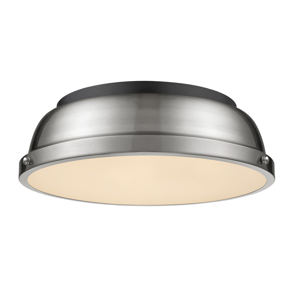 Experience sophisticated charm with the Yep by Golden Lighting Duncan 2-light Flush Mount. Featuring a Pewter Metal shade and a Matte Black frame, it adds a classic touch to any room while providing bright illumination. The metal shade showcases a warm, medium-toned Pewter finish with a brushed texture that softly diffuses light, creating a warm and inviting ambiance. This durable and stylish finish adds a timeless appeal, making it a versatile addition to various decor styles. Paired with a sleek Matte Black finish, this fixture marries tradition with a contemporary twist, suitable for a range of interior aesthetics. Perfect for low ceilings in hallways, laundry areas, and bathrooms, it is damp location rated for safety in areas with occasional moisture. Overall Dimensions: 14"W x 4.25"H x 14"D, requiring 2 E26 Medium base bulbs (not included), max 60 wattage per bulb. Infuse your home with quality, durability, and sophisticated design through this elegant lighting solution.