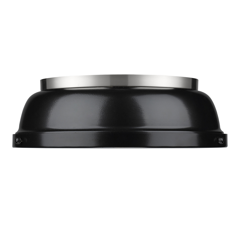 Bring rustic elegance into your home with the Yep by Golden Lighting Duncan 2-light Flush Mount. Featuring a metal shade and a pewter frame, it creates a welcoming atmosphere. The metal shade boasts a Glossy Black finish that features a deep, uniform black color with a highly reflective, polished sheen, adding a touch of modern sophistication. The pewter finish provides a soft and classic alternative to brighter silver tones, with its medium-grey hue and subtle warmth giving an understated appeal. Ideal for low ceilings in hallways, closets, laundry areas, bathrooms, and more, this fixture is rated for damp locations, making it suitable for covered and semi-enclosed spaces with occasional moisture. Requires 2 E26 Medium base bulbs (not included) with a maximum wattage of 60. Dimensions: 14"W x 4.25"H x 14"D. Transform your space with quality and timeless charm.