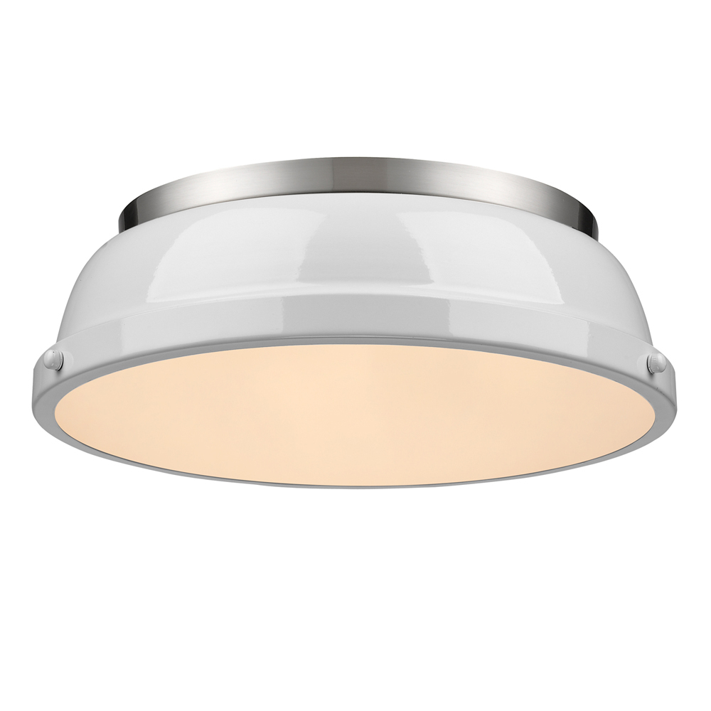 Bring timeless elegance into your home with the Yep by Golden Lighting Duncan 2-light Flush Mount. Featuring a Metal shade and a Pewter frame, it creates a welcoming atmosphere. The Metal shade in White offers a solid, bright finish with a highly reflective, glossy sheen, resulting in excellent light reflection that brightens your space effectively. Our Pewter finish lends a classic charm with subtle warmth, enhancing both vintage and modern interior styles. Ideal for low ceilings in hallways, closets, and bathrooms, this fixture is also Damp Location Rated for use in areas with occasional moisture. With dimensions of 14"W x 4.25"H x 14"D, it requires 2 E26 Medium base bulbs (not included), max 60 wattage per bulb. This elegant lighting solution adds functional beauty to your spaces, making it a perfect addition to both contemporary and classic interiors.