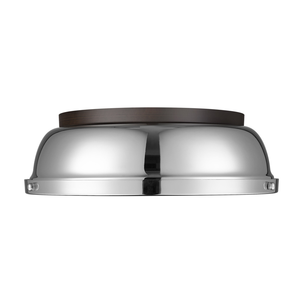 Bring classic elegance into your home with the Yep by Golden Lighting Duncan 2-light Flush Mount. Featuring a Metal shade and a Rubbed Bronze frame, it creates a welcoming atmosphere. The Metal shade beautifully complements the design, allowing for wide illumination that brightens your space. The Chrome accents add a sleek touch, ensuring the fixture stands out while effortlessly integrating into your decor. This timeless Rubbed Bronze finish is a versatile choice, bringing warmth and richness to any design, seamlessly fitting various styles from traditional to industrial. Ideal for low ceilings in hallways, closets, laundry areas, bathrooms, and more, this fixture is Damp Location Rated, suitable for spaces with occasional moisture. It requires 2 E26 Medium base bulbs (not included), with a maximum wattage of 60 per bulb. Overall dimensions measure 14"W x 4.25"H x 14"D, making it a compact yet powerful light source. Brighten your home with quality and style that speaks to your aesthetic.