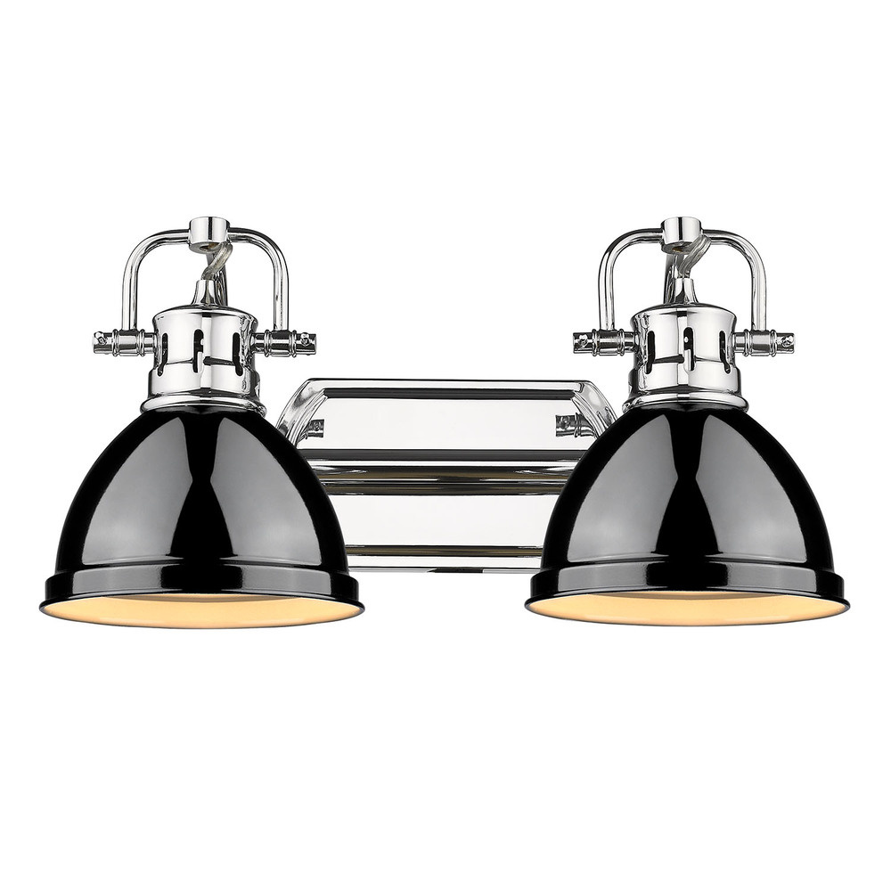 Bring traditional elegance into your home with the Yep by Golden Lighting Duncan 2-light Vanity in Chrome and Black. Featuring a metal shade and a polished chrome frame, it creates a welcoming atmosphere. The sleek metal shade boasts a glossy black finish with a highly reflective sheen, making a bold and luxurious statement in your space. Brilliant and timeless, the chrome finish offers a crisp and clean look, seamlessly integrating into a wide range of decor styles from ultra-modern to classic traditional, while its durable electroplating process ensures easy maintenance. Brighten up bathrooms with dedicated lighting that flatters while providing practical task illumination. This fixture is damp location rated, suitable for covered and semi-enclosed spaces with occasional moisture, like bathrooms and laundry rooms. With adjustable directional heads, customize the lighting to highlight specific areas or objects by pivoting the individual heads. Overall dimensions are 16.5"W x 8.5"H x 8.25"D, requiring 2 E26 Medium base bulbs (not included), with a maximum wattage of 100 per bulb. Experience the perfect blend of style and quality that this vanity light brings to your home.