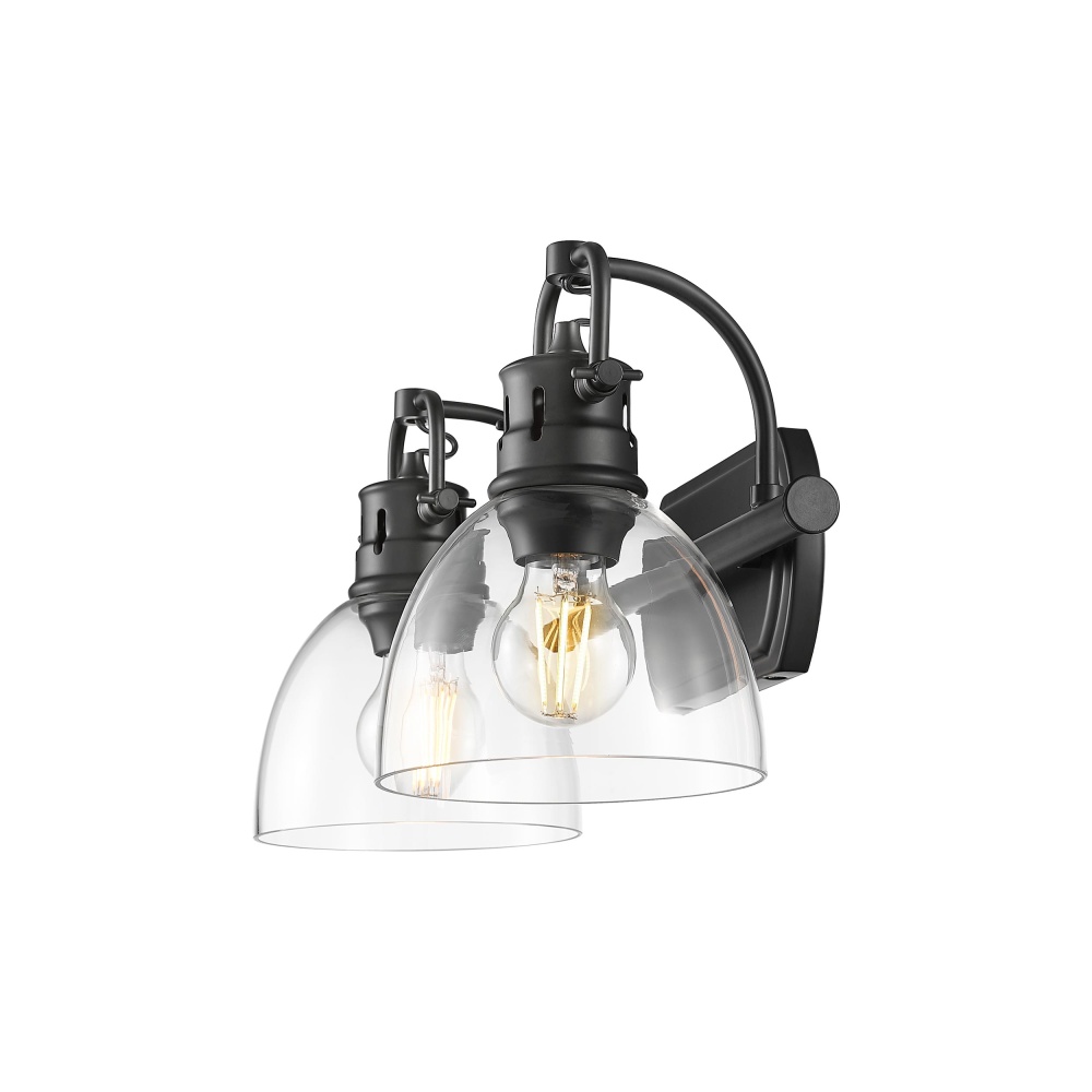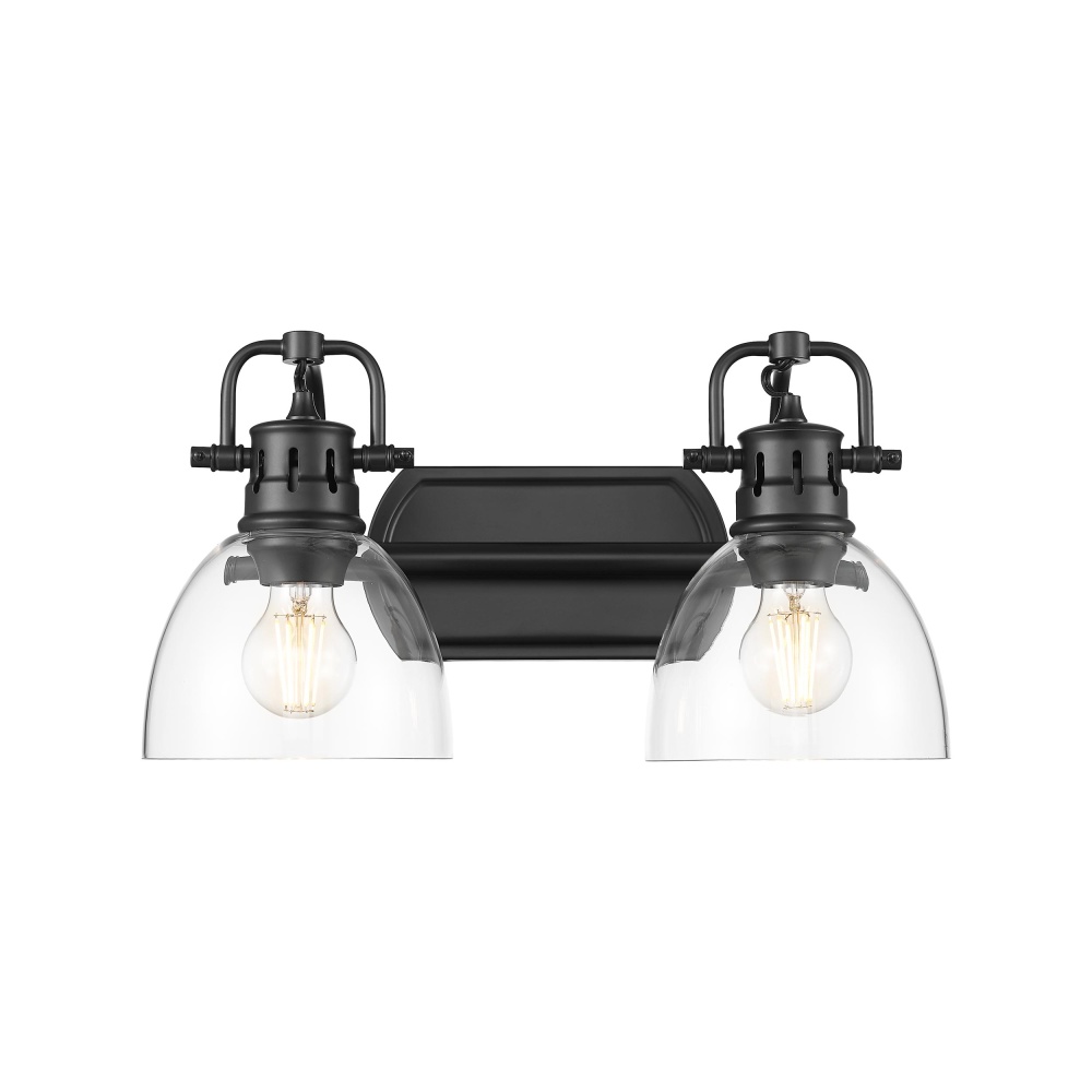 Bring traditional elegance into your home with the Yep by Golden Lighting Duncan 2-light Vanity in Matte Black and Clear Glass. Featuring a clear glass shade and a matte black frame, it creates a welcoming atmosphere. The clear glass shade features brilliantly unobstructed light, showcasing your choice of bulbs beautifully. This timeless glass complements a wide array of styles, from industrial to contemporary, enhancing your space with its clean and inviting appeal. The matte black finish is not only timeless but also endlessly versatile, offering a seamless design that fits various decors from minimalist to bold. Brighten up bathrooms with dedicated lighting that flatters while providing practical illumination. This fixture is damp location rated, making it suitable for use in bathrooms, covered porches, and laundry rooms. It includes adjustable directional heads, allowing you to customize the lighting to highlight specific areas or objects by pivoting the individual heads. Overall Dimensions: 16.5"W x 8.5"H x 8.25"D. Requires 2 E26 Medium base bulbs (not included, max wattage 100 per bulb). Elevate your bathroom experience with the quality craftsmanship of the Yep by Golden Lighting.