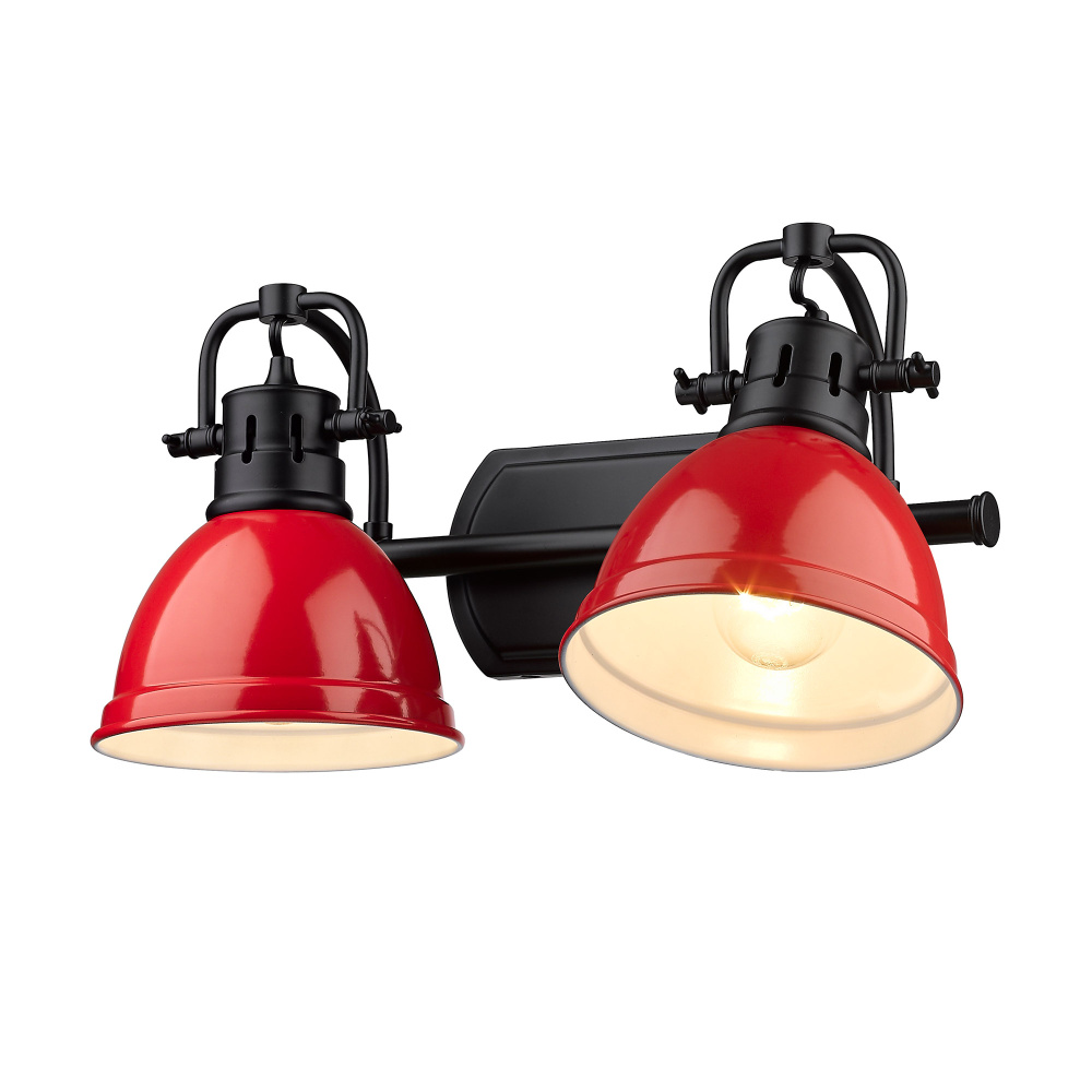 Bring vintage charm into your home with the Yep by Golden Lighting Duncan 2-light Vanity. Featuring a glossy Red metal shade and a Matte Black frame, it creates a vibrant atmosphere. The Red shade adds a striking pop of color with its smooth, high-gloss finish, making it a statement piece in any setting. The Matte Black finish offers a contemporary and elegant foundation that complements a variety of aesthetics. As a damp-rated fixture, it is perfect for bathrooms, providing both style and function. The adjustable directional heads allow for customized lighting, enhancing specific areas. Overall dimensions are 16.5"W x 8.5"H x 8.25"D, using 2 E26 Medium base bulbs (not included) with a maximum wattage of 100. Elevate your bathroom with this eye-catching fixture that balances charm with practical lighting solutions.